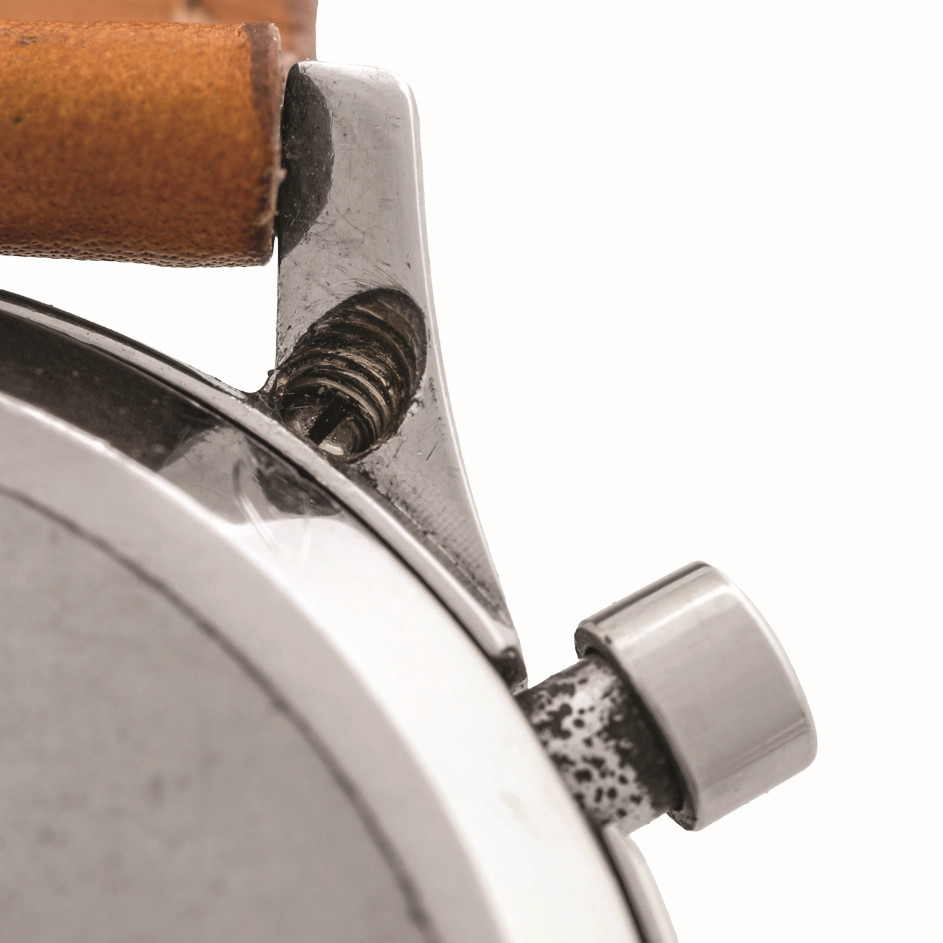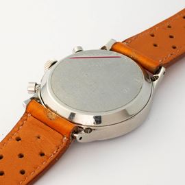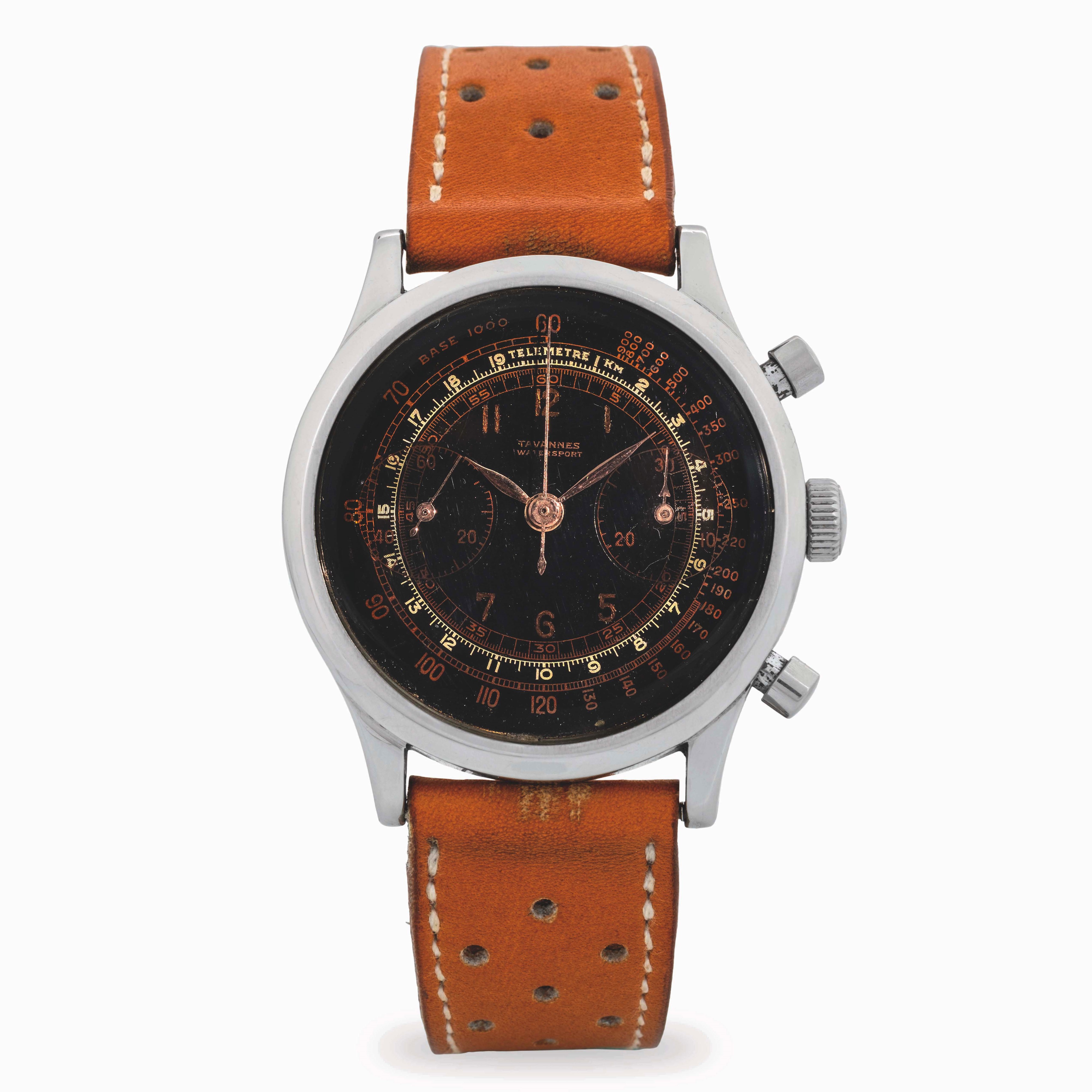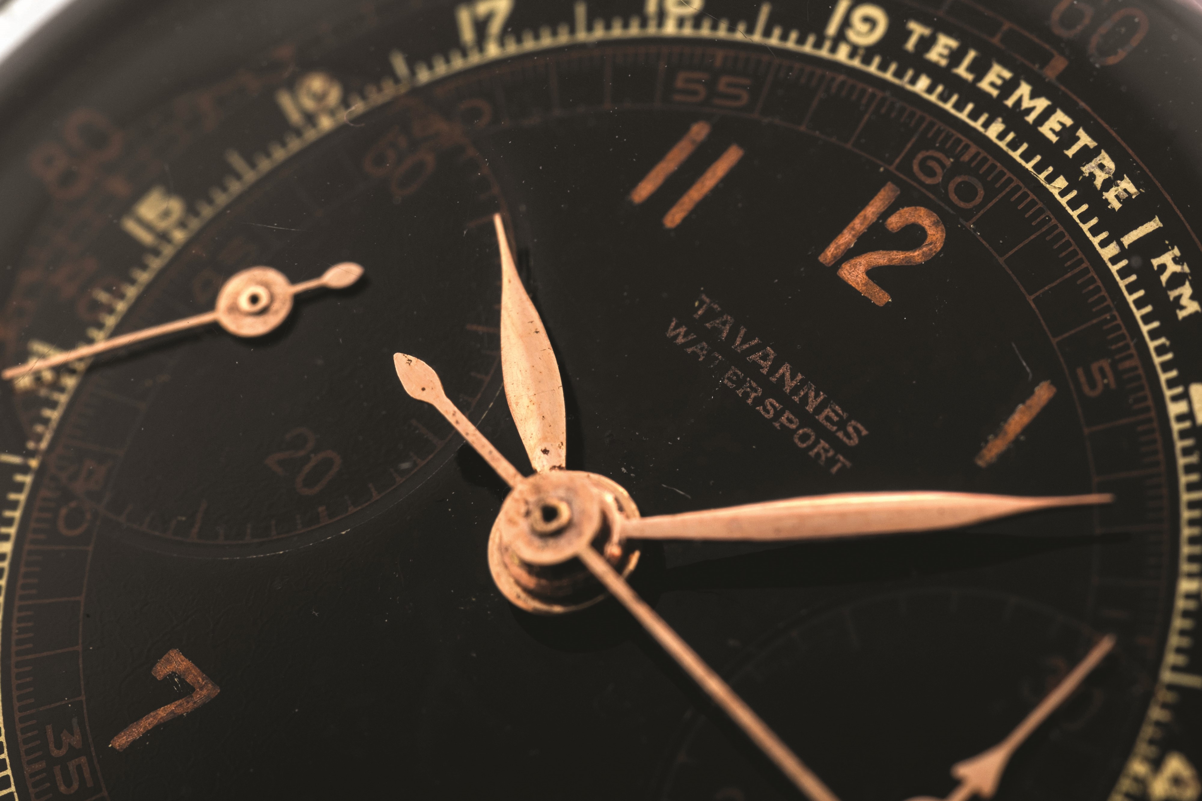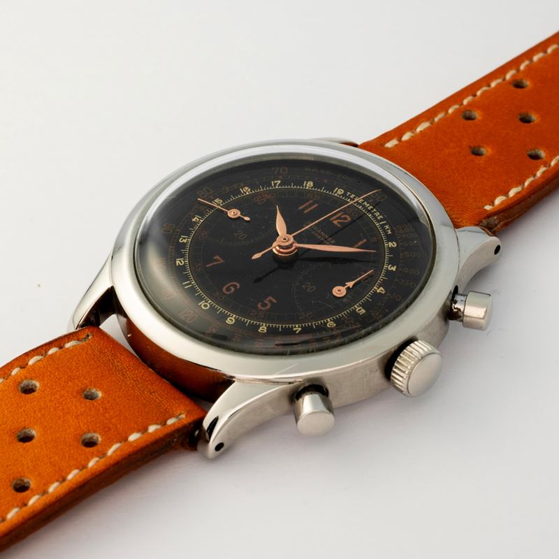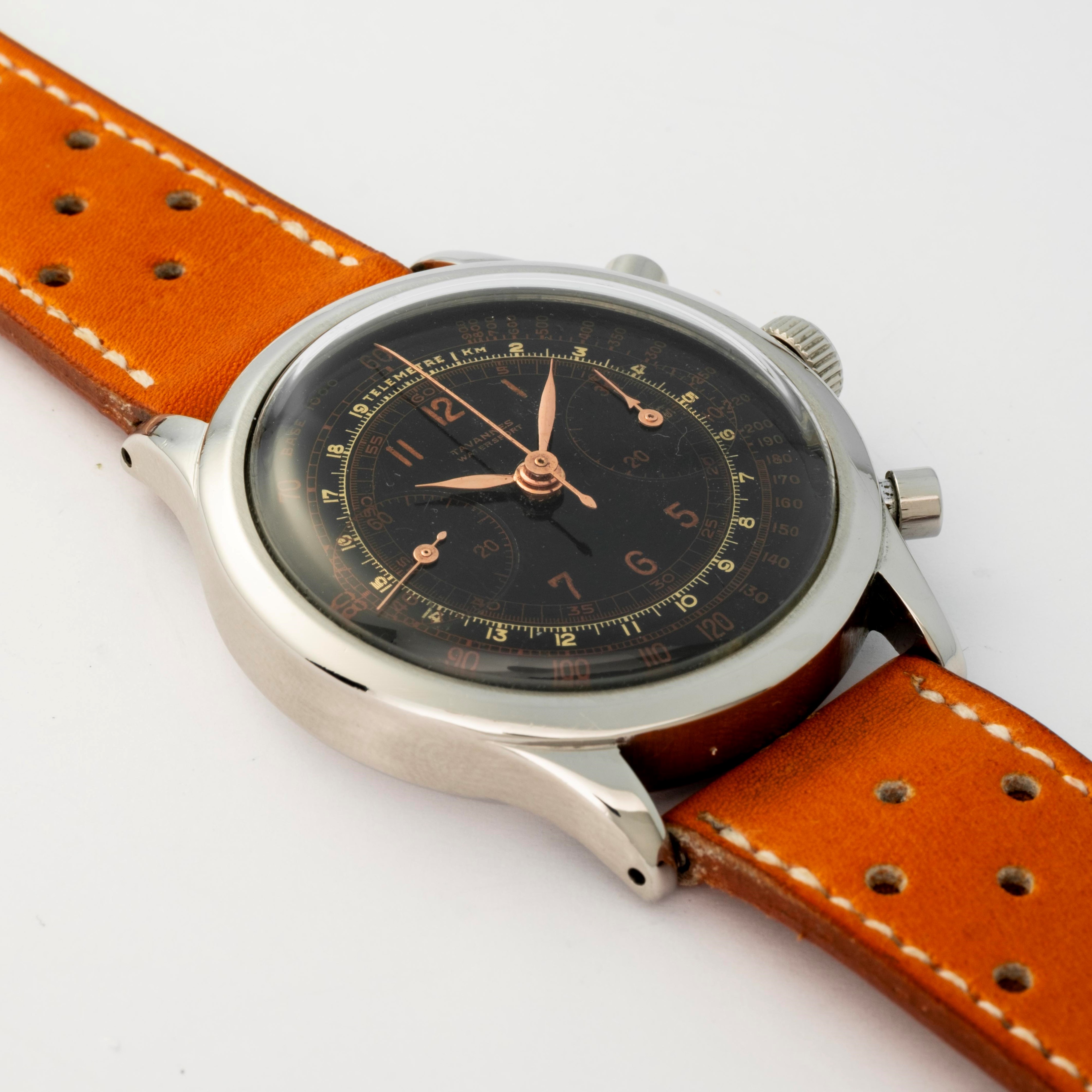 Clamshell Cronografo impermeabile tasti a pompa in acciaio con quadrante nero galvanico due colori, circa 1940