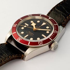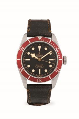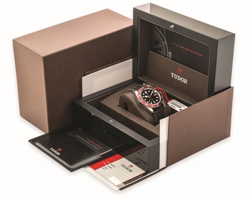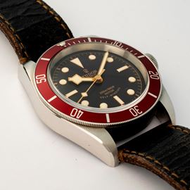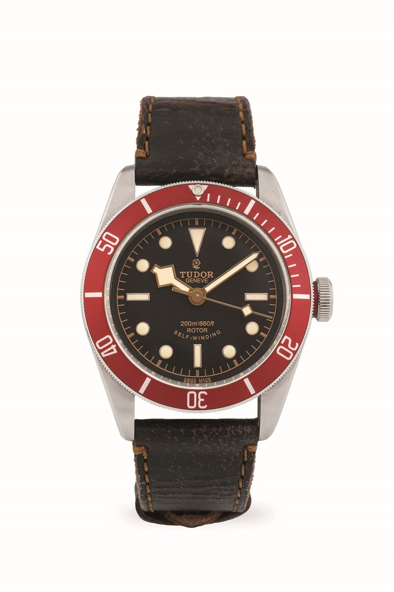 Black Bay ref. 79220R in acciaio con quadrante nero e ghiera rossa, con cinturino in pelle e chiusura originale, circa 20 [..]