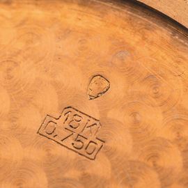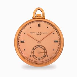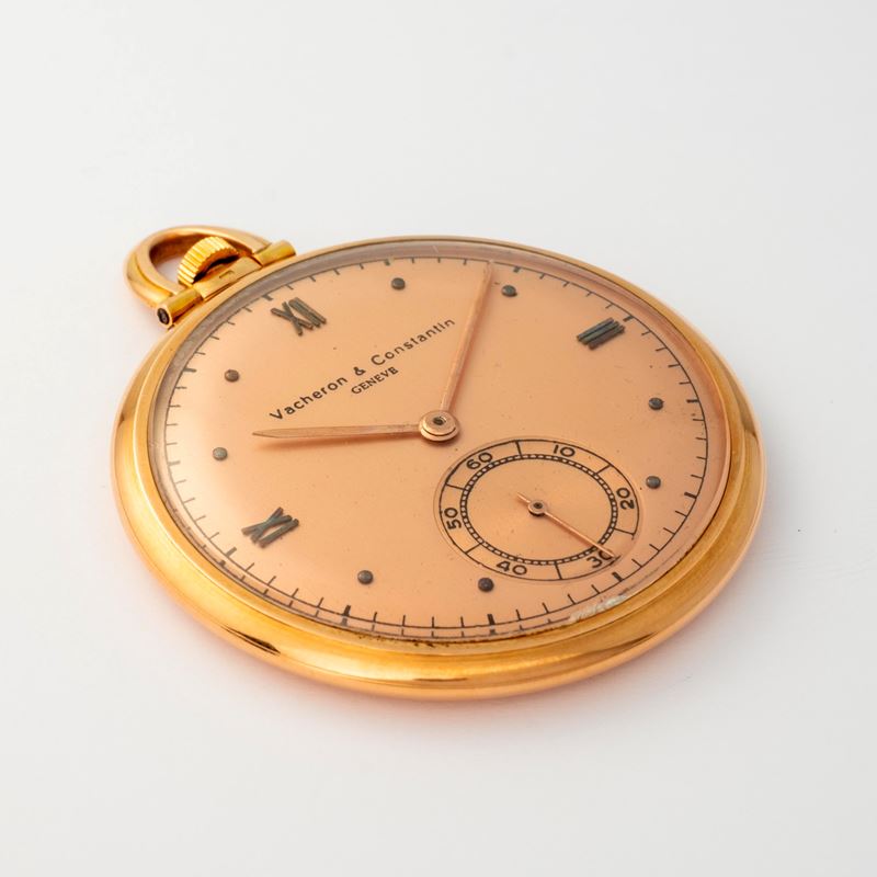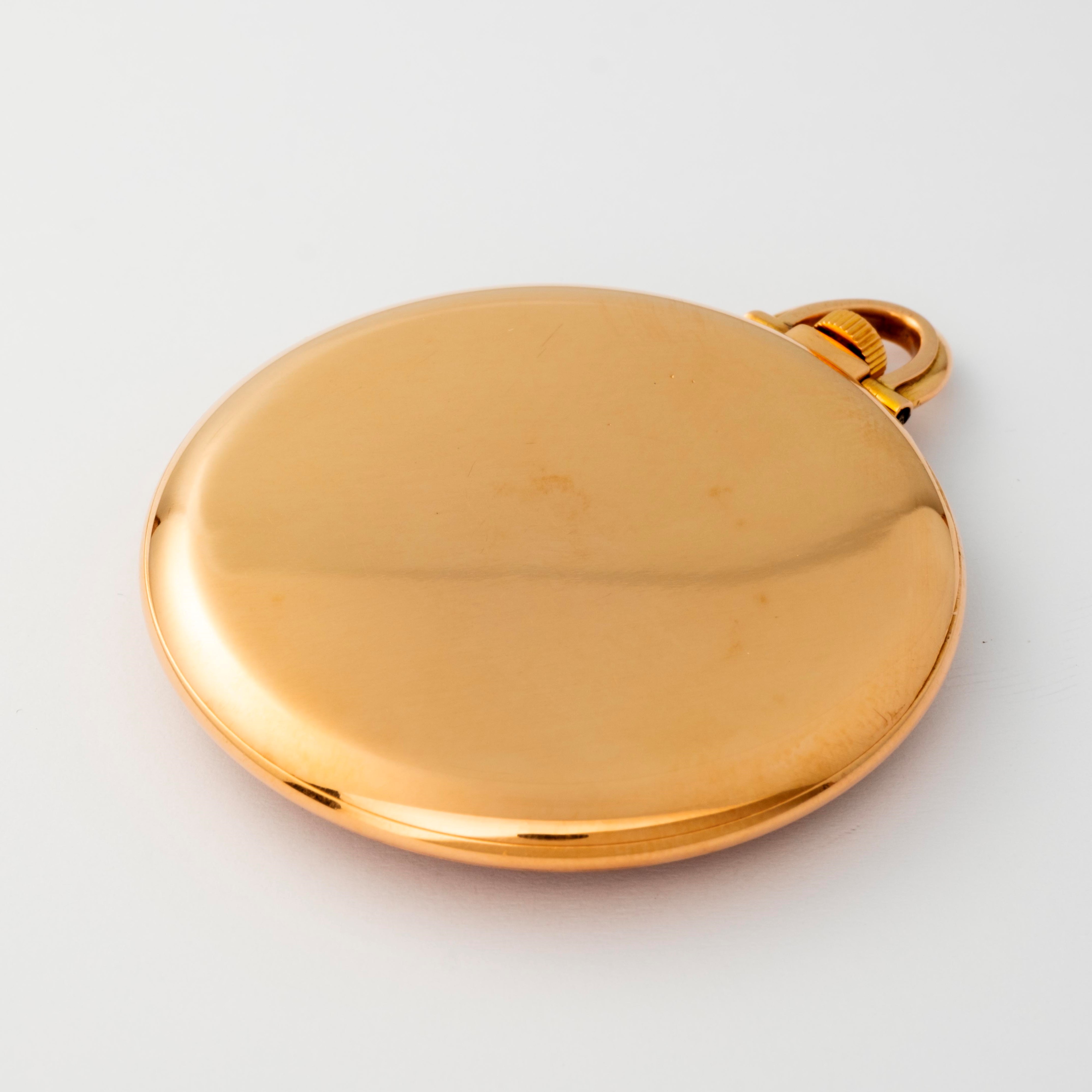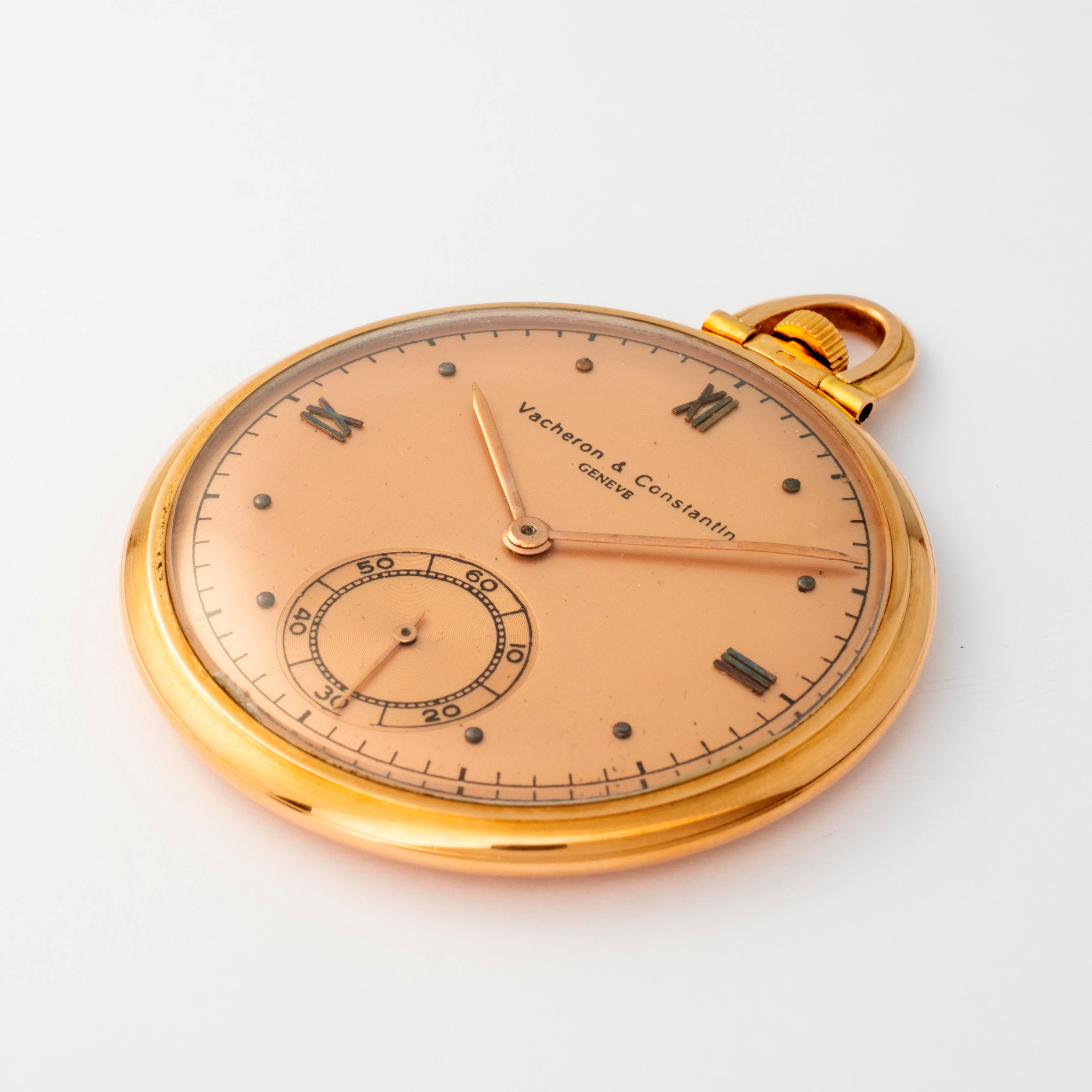 Tasca in oro rosa 18k, quadrante salmone con numeri romani, indici applicati e secondi al sei, circa 1935