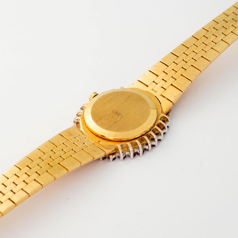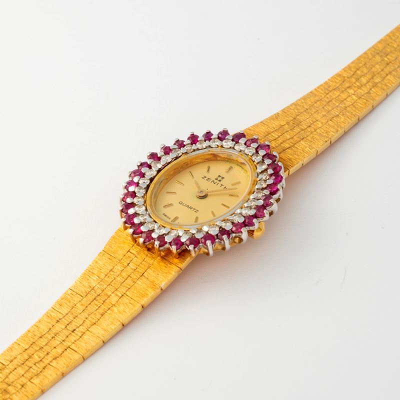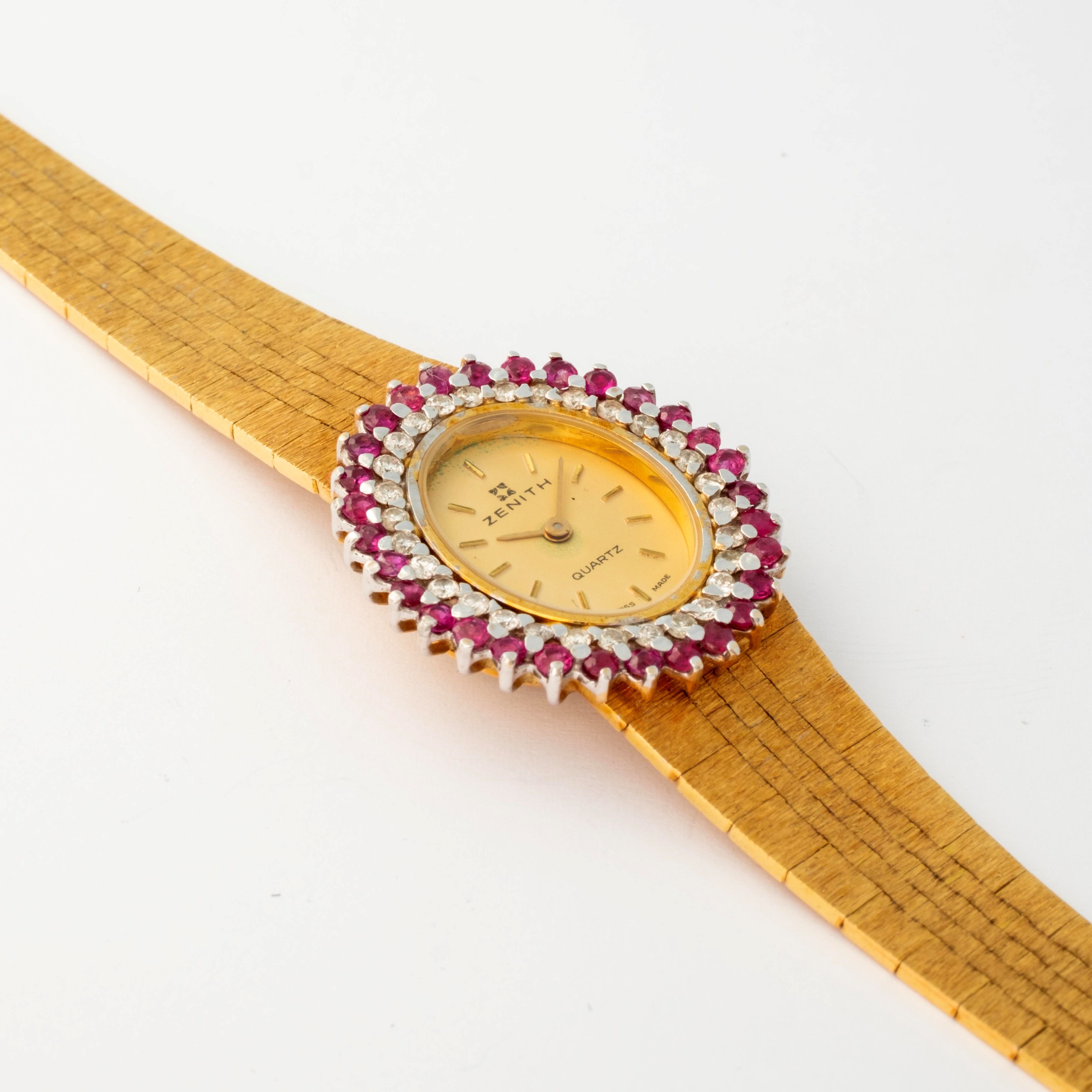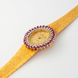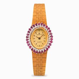 Lady in oro giallo 18k con diamanti e rubini quadrante champagne, circa 1970
