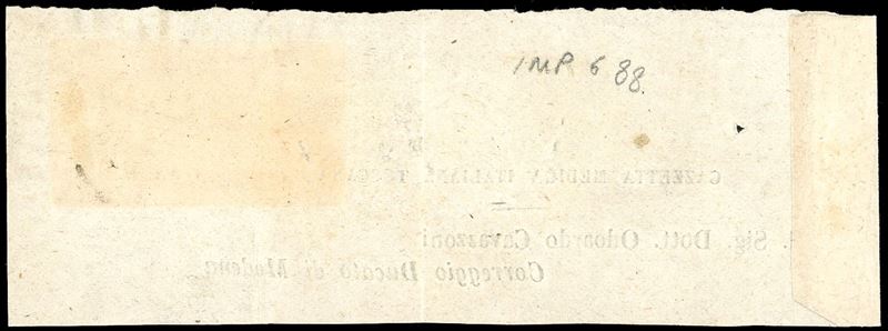 1851 - 1 soldo bistro arancio su grigio (2d), coppia orizzontale, un esemplare con bella varietà di clichè, lievi difetti, annullata con il bollo a cinque sbarre di Firenze, su fresca fascetta della Gazzetta Medica Italiana Toscana per Correggio, nel Ducato di Modena. Tariffa di 2 soldi ed affrancatura estremamente rare. Cert. Raybaudi ed E.Diena.