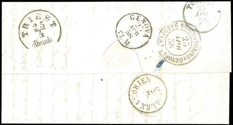 1858 - Lettera non affrancata da Parma 21/4/1858 ad Alessandria d'Egitto, sul fronte manoscritto "Via Trieste" e diversi segni di tassa, al verso numerosi bolli di transito e di arrivo. Affascinante e rarissima destinazione, probabilmente unica dal Ducato di Parma in periodo filatelico. Da esposizione. Cert. Ferrario.