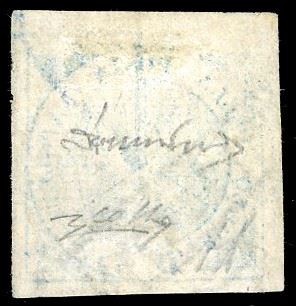 1860 - 1/2 tornese azzurro Trinacria, doppia incisione della "T" spostamento verticale, filigrana cornice (15b), usato, perfetto e ben marginata. Rara e di ottima qualità. Cert. A.Diena e Colla.