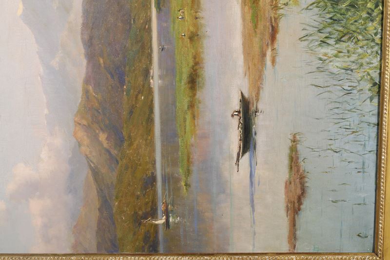 Paesaggio con montagne, lago e figurine