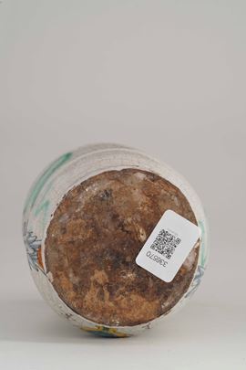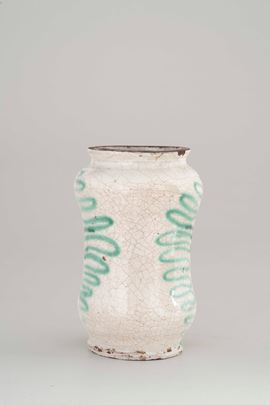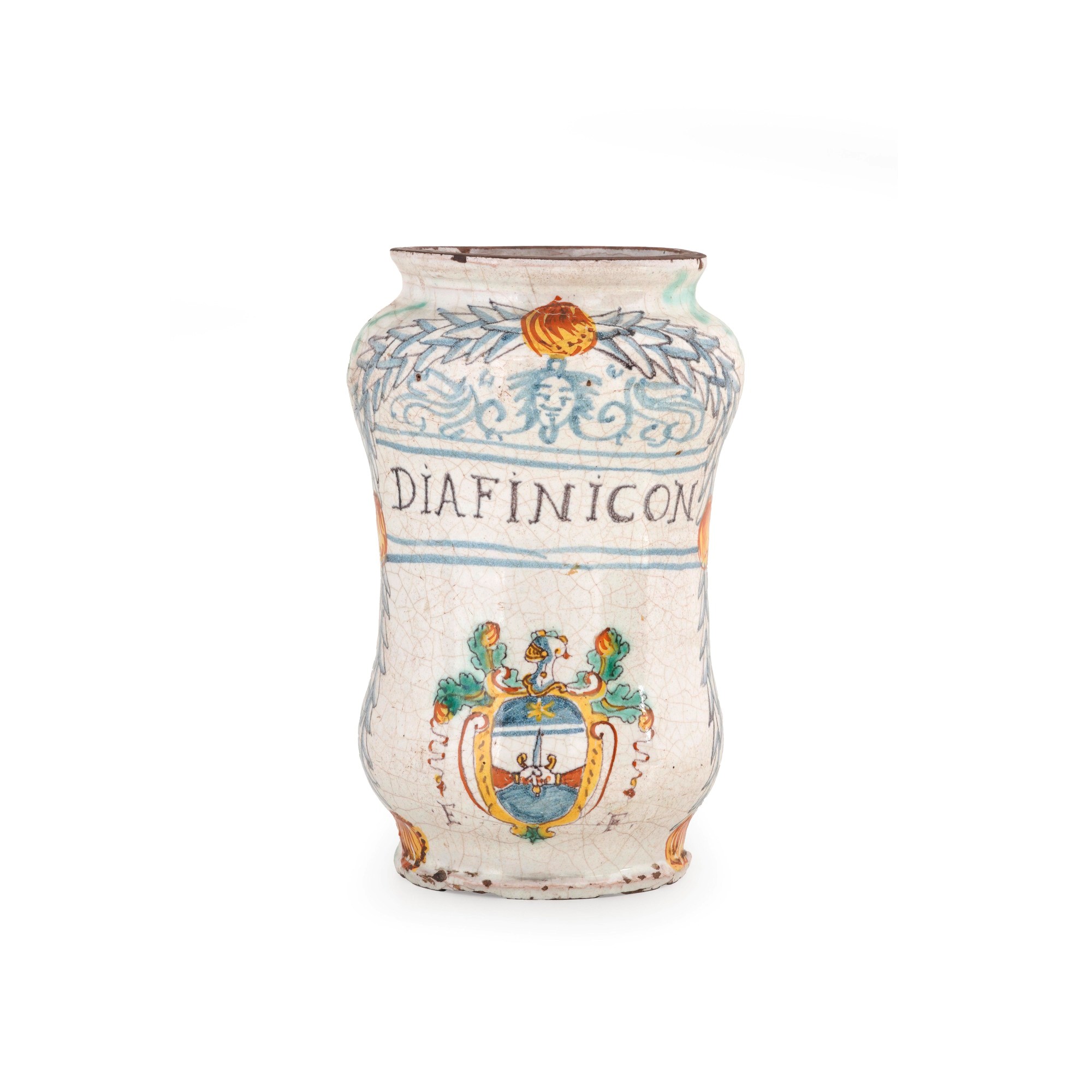 Albarello da farmacia con, nel decoro, una corona fogliata e la scritta apotecaria “DIAFINICON” in manganese, che inquadrano uno stemma ovale, con due mani che impugnano una spada dominati da una stella, dalla cornice accartocciata con un elmo a cimiero, tra foglie, nastri, e le iniziali “F.F.”