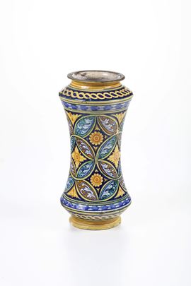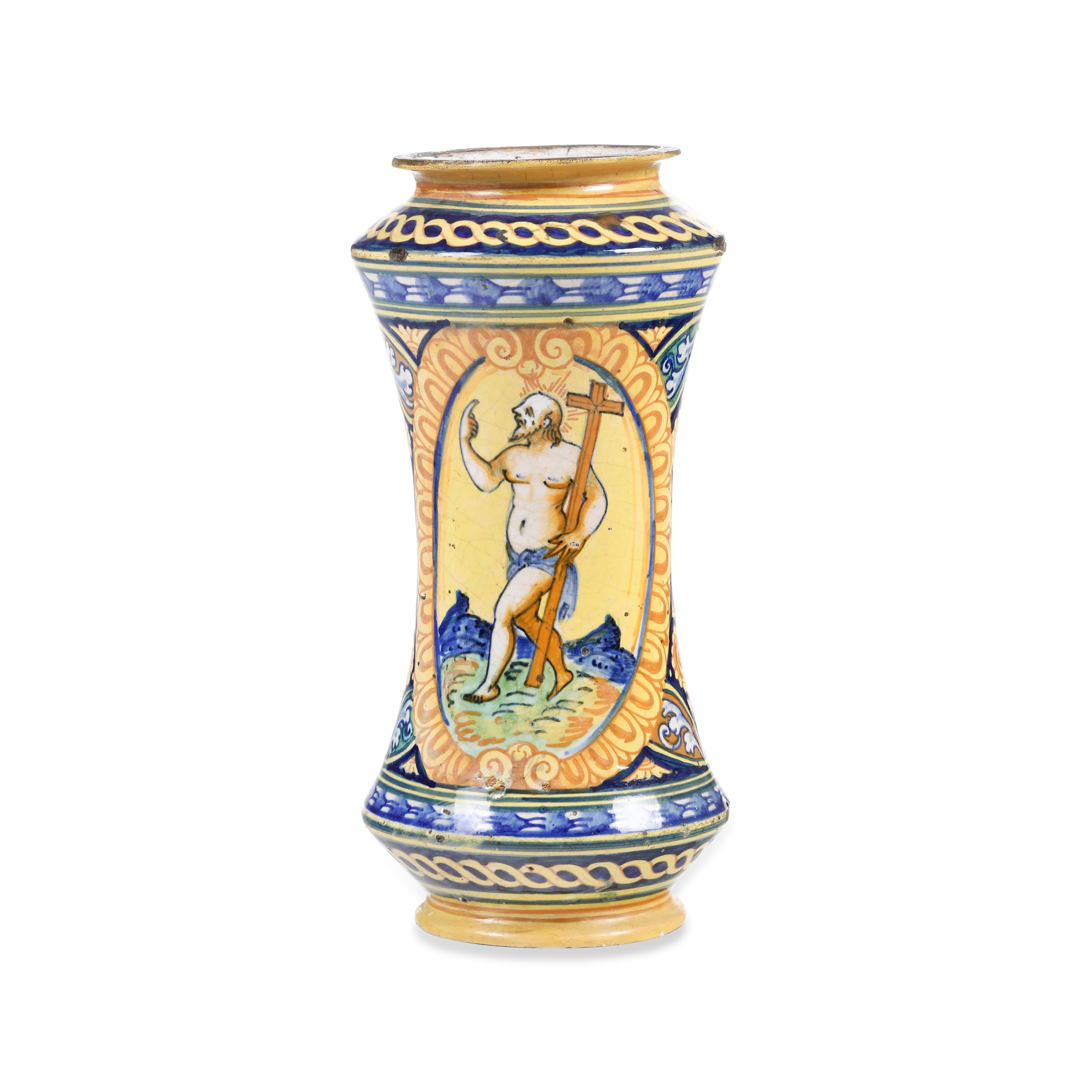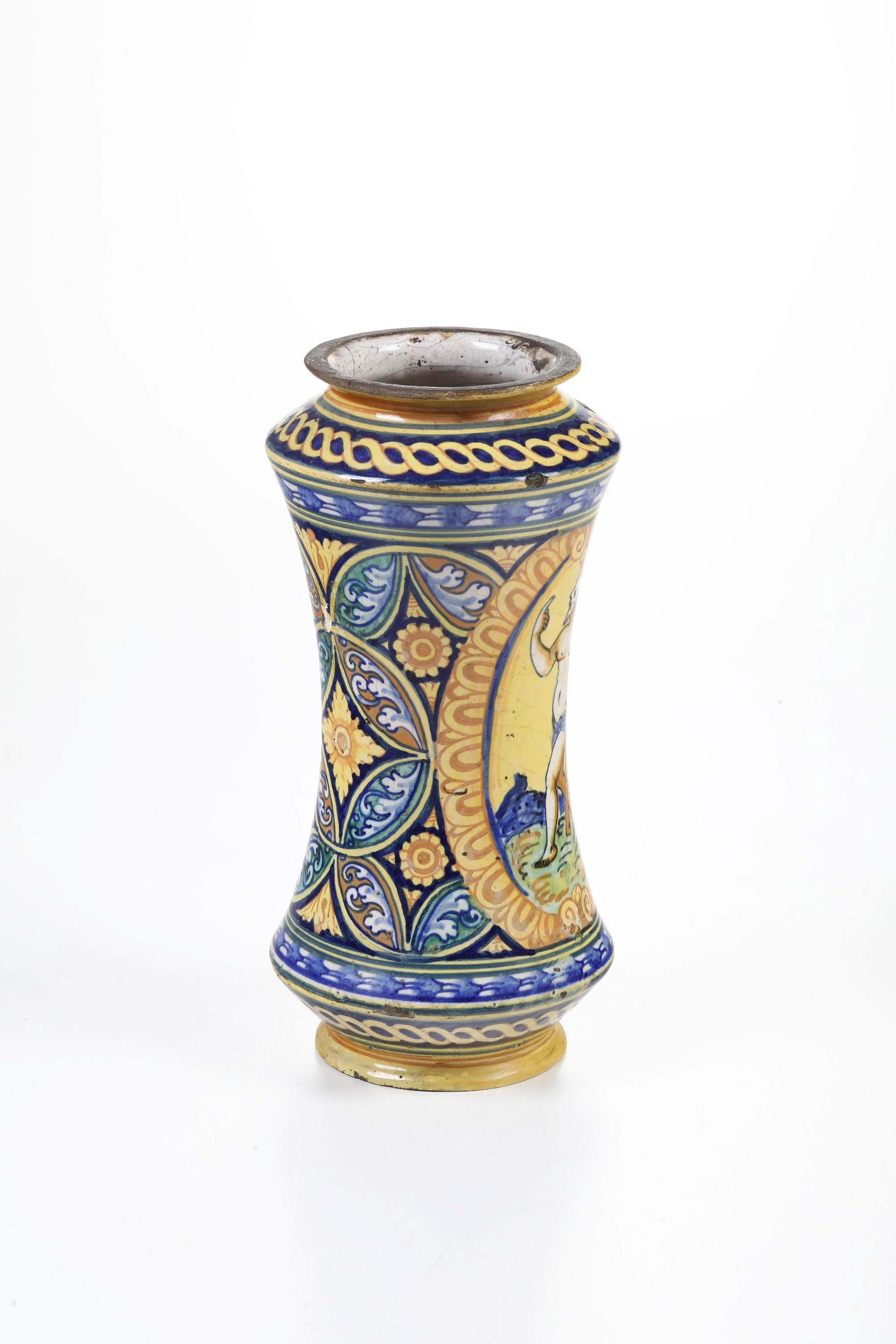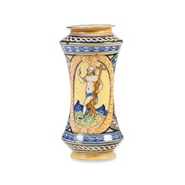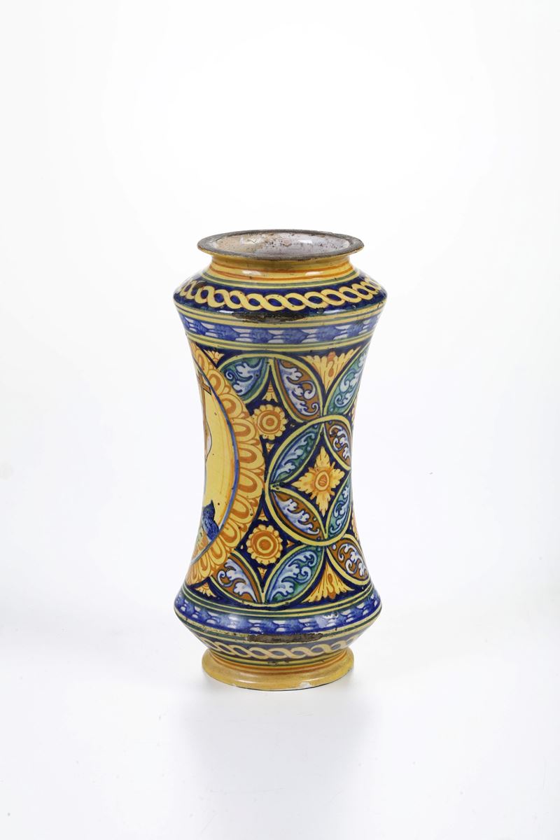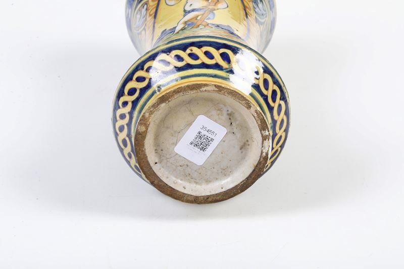 Maiolica policroma. Altezza cm 29,5. Conservazione: ottima; restauri al bordo inferiore e superiore; piccole cadute di smalto