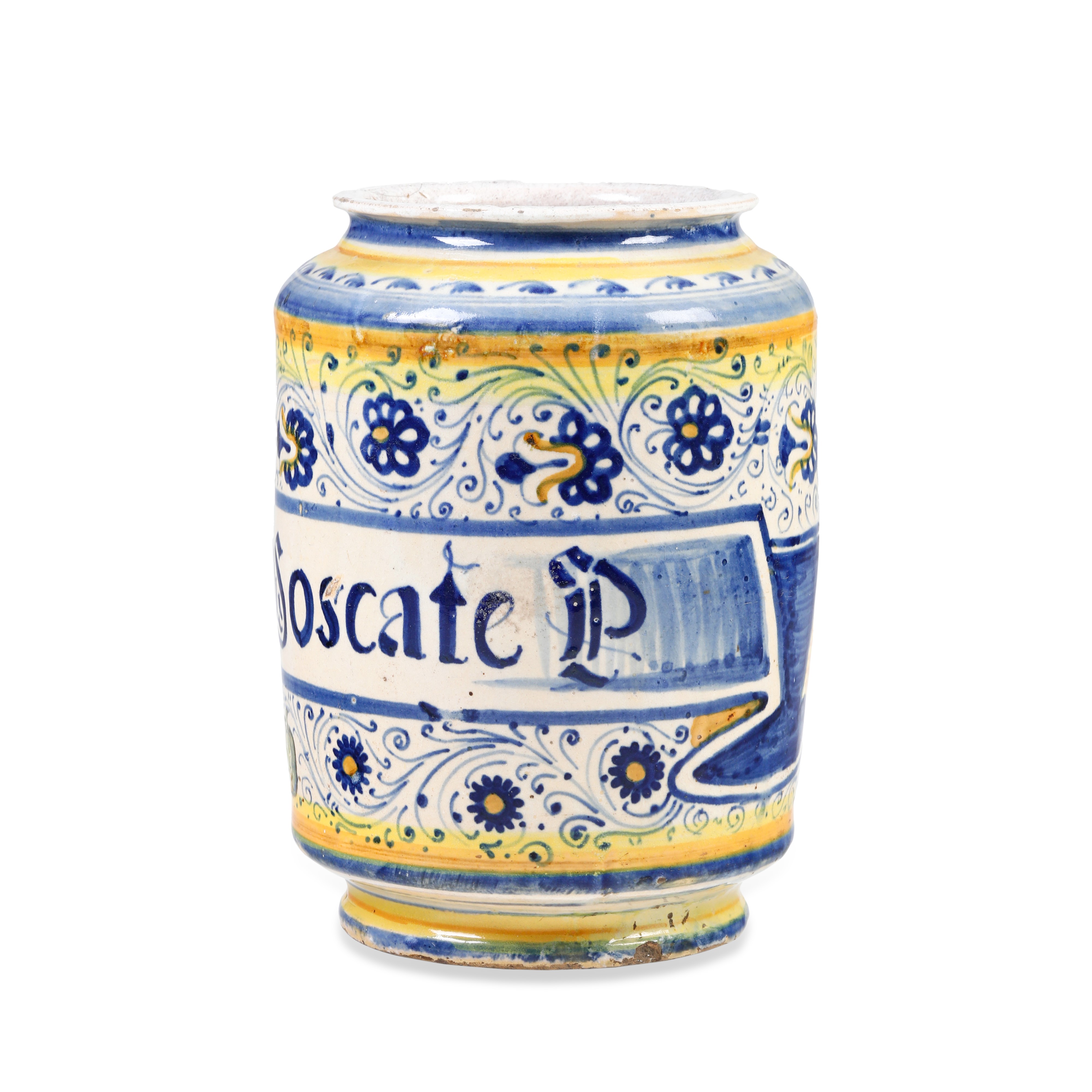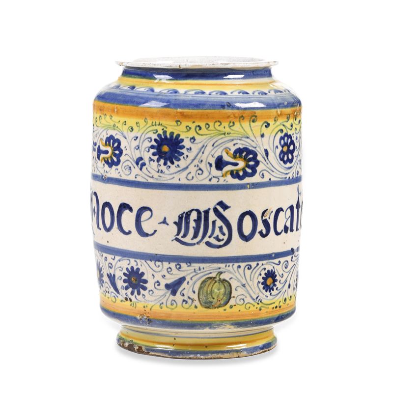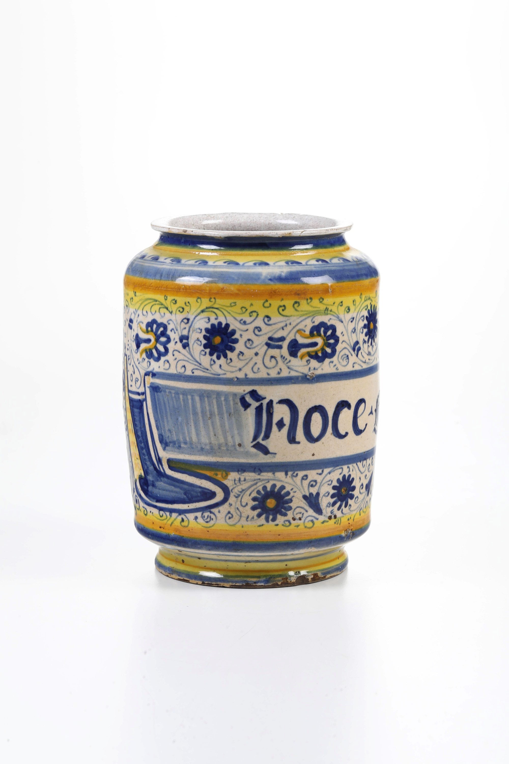 Presenta un corpo cilindrico, lievemente svasato e bombato, con spalla arrotondata, ed è decorato con roselline e palmette persiane tra girali. Al centro si trova un cartiglio con la scritta apotecaria "Noce Moscata" e, nel registro inferiore, un frutto. Sul verso, due palmette separano le due estremità del cartiglio.
