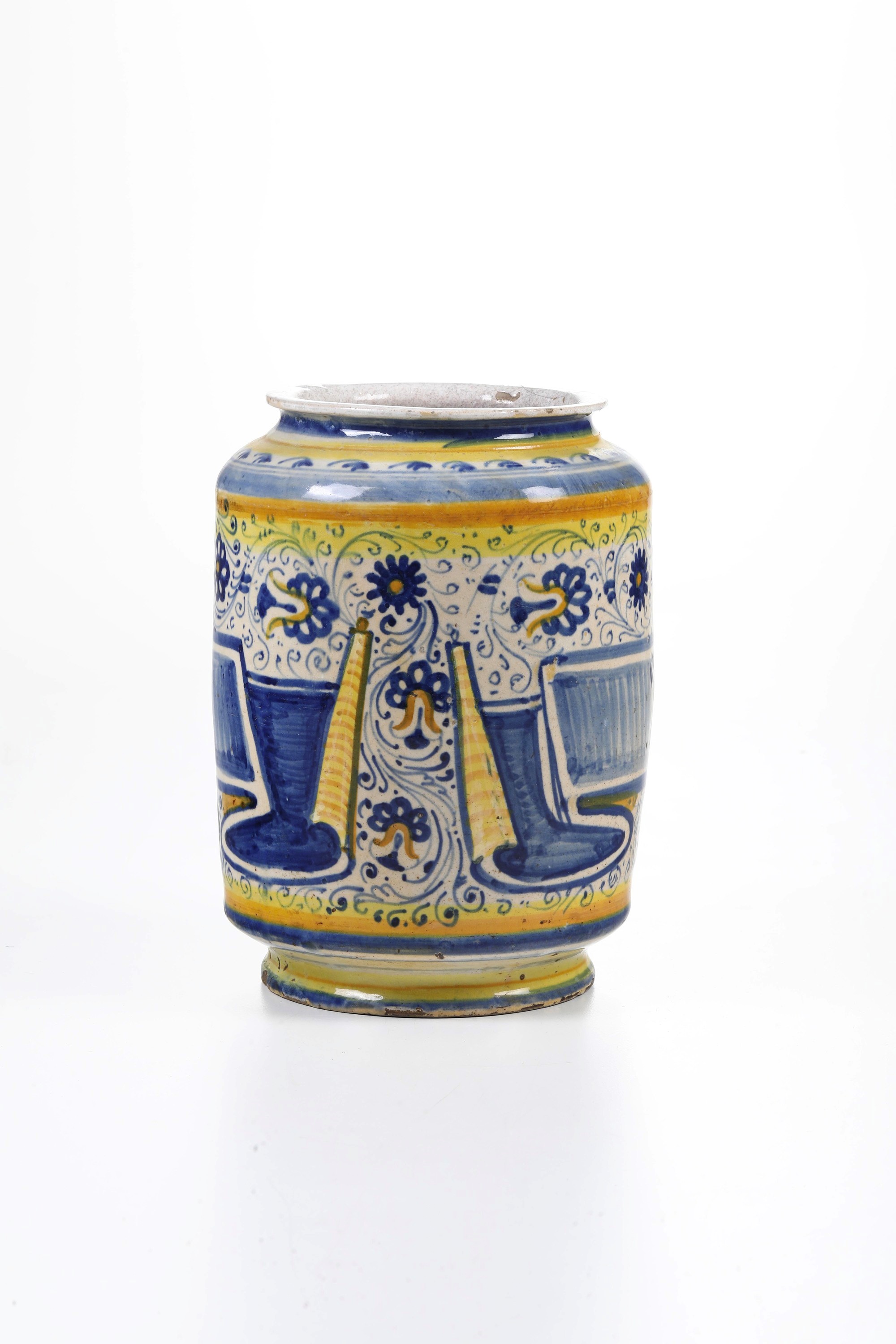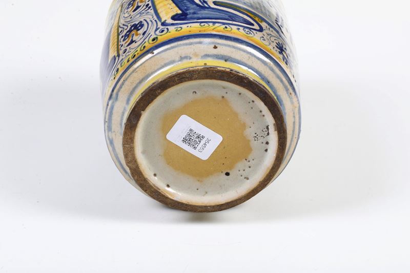 Maiolica. Altezza cm 23. Conservazione: ottima; piccolo frammento al bordo superiore incollato; minime sbeccature al bordo inferiore