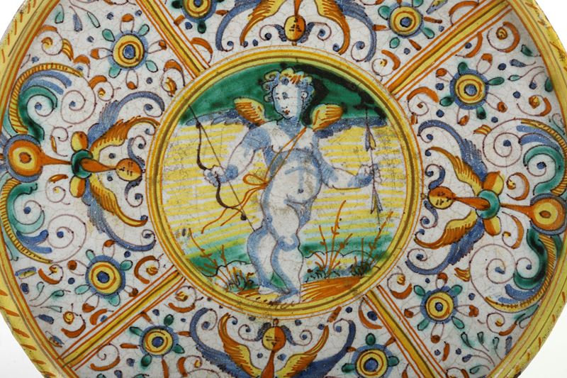 La decorazione policroma di questa alzata vede al centro Cupido che intercede verso destra e tiene in mano un arco e una freccia, incorniciato da un tondo filettato e da una larga fascia "a grottesche" con arpie. Queste decorazioni a grottesche derutesi riprendono quelle urbinati del secolo precedente
