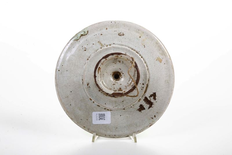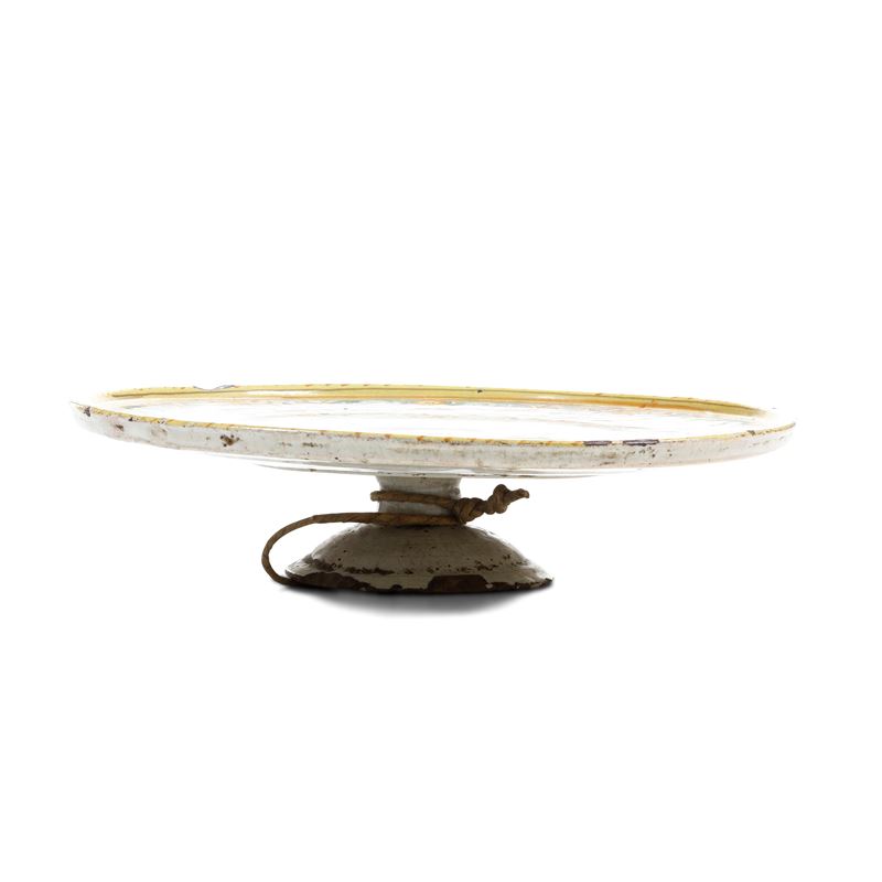 Maiolica. Dimensioni: altezza cm 6; diametro cm 25,3. Conservazione: ottima; piccole sbeccature ai bordi
