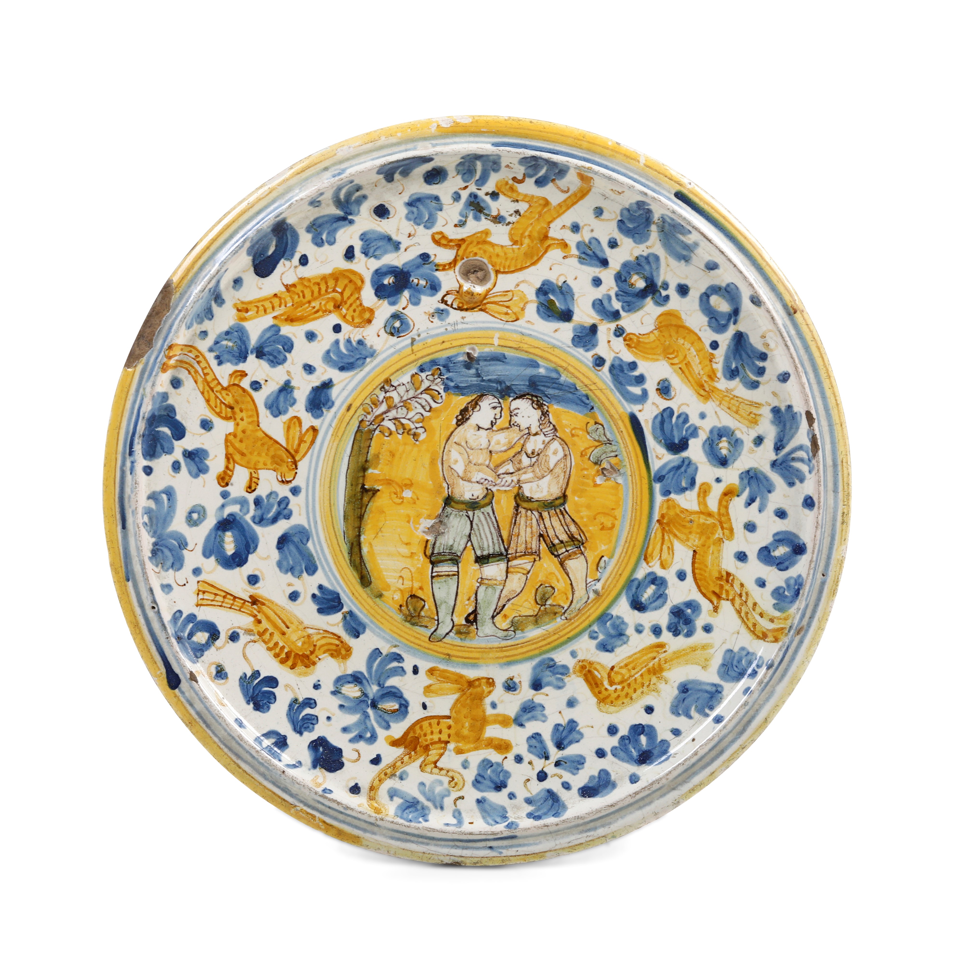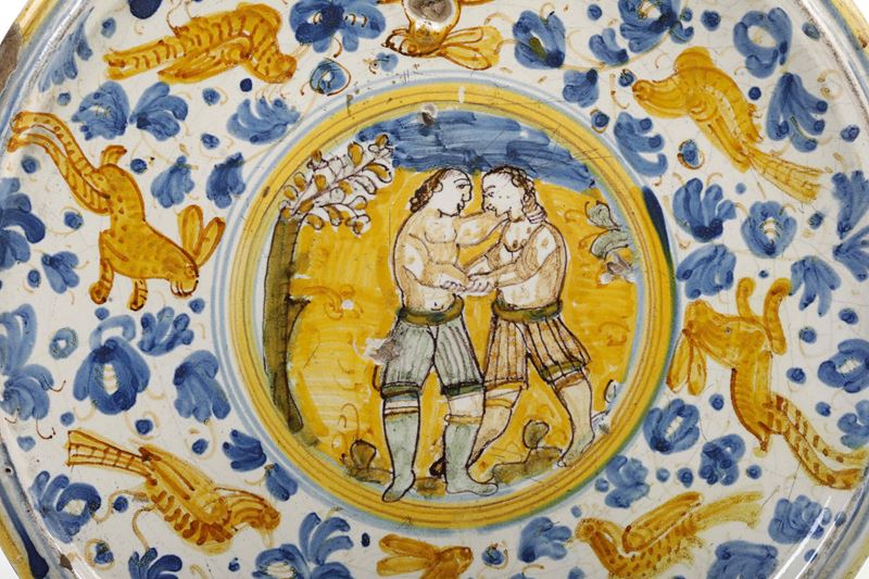 In questo caso, tuttavia, l’opera si eleva notevolmente dalla produzione derutese più corrente in quanto coniuga la decorazione “calligrafico-naturalistica” ad una scena “istoriata” moderna, cioè ispirata a una tema di costume del tempo, quello della lotta. In particolare si tratta della lotta in piedi tra due combattenti che, a petto nudo, si affrontano in una posizione di contatto corpo a corpo, utilizzando delle prese sulla parte superiore del corpo