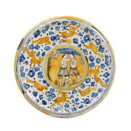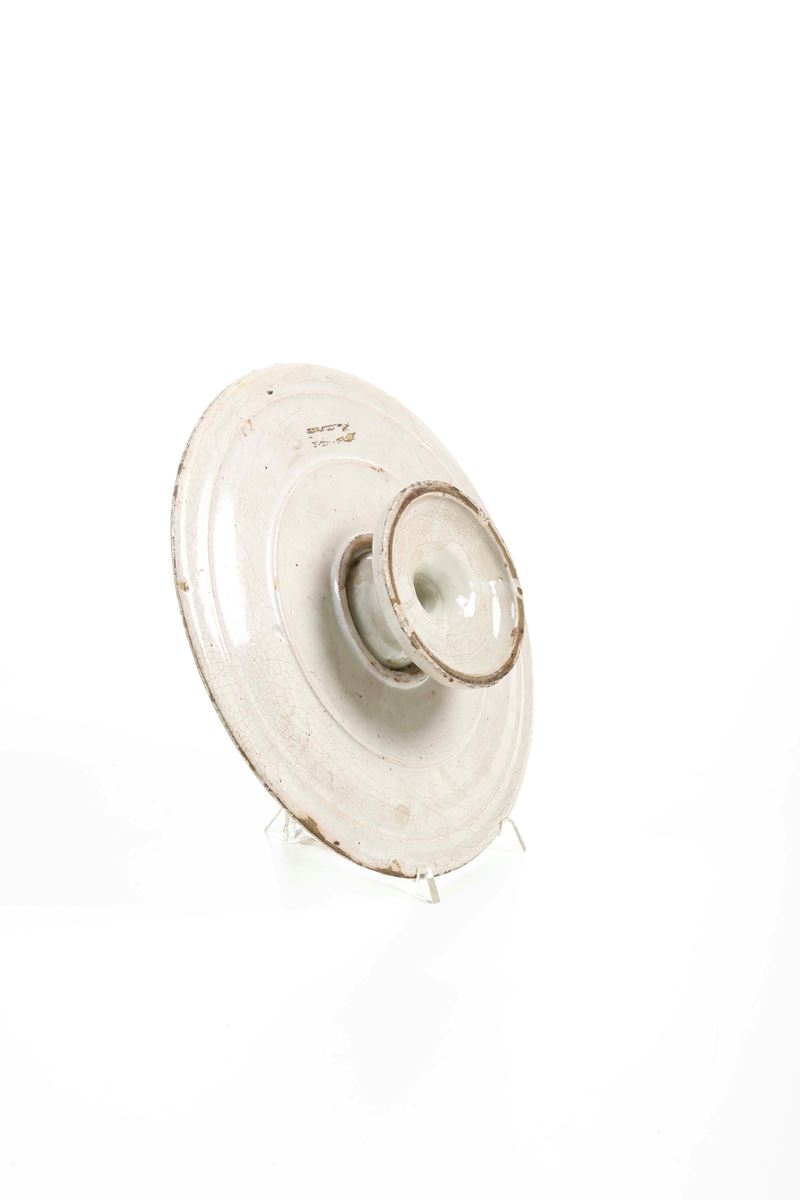 Maiolica. Dimensioni: altezza cm 6,5; diametro cm 27,5. Conservazione: ottima; sbeccatura al bordo alle ore 10; insignificanti usure
