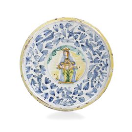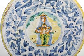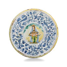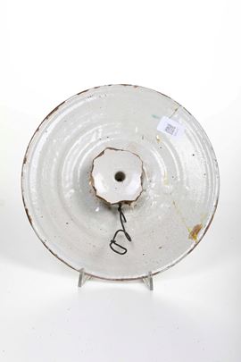 Maiolica. Dimensioni: altezza cm 6; diametro cm 29,5. Conservazione: rotta in due frammenti tra le ore 8 e le ore 11; mancanze al piede; leggere perdite di smalto all’orlo