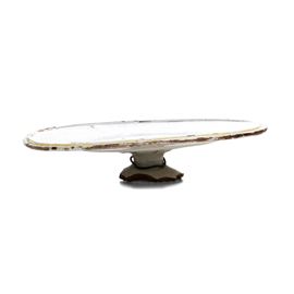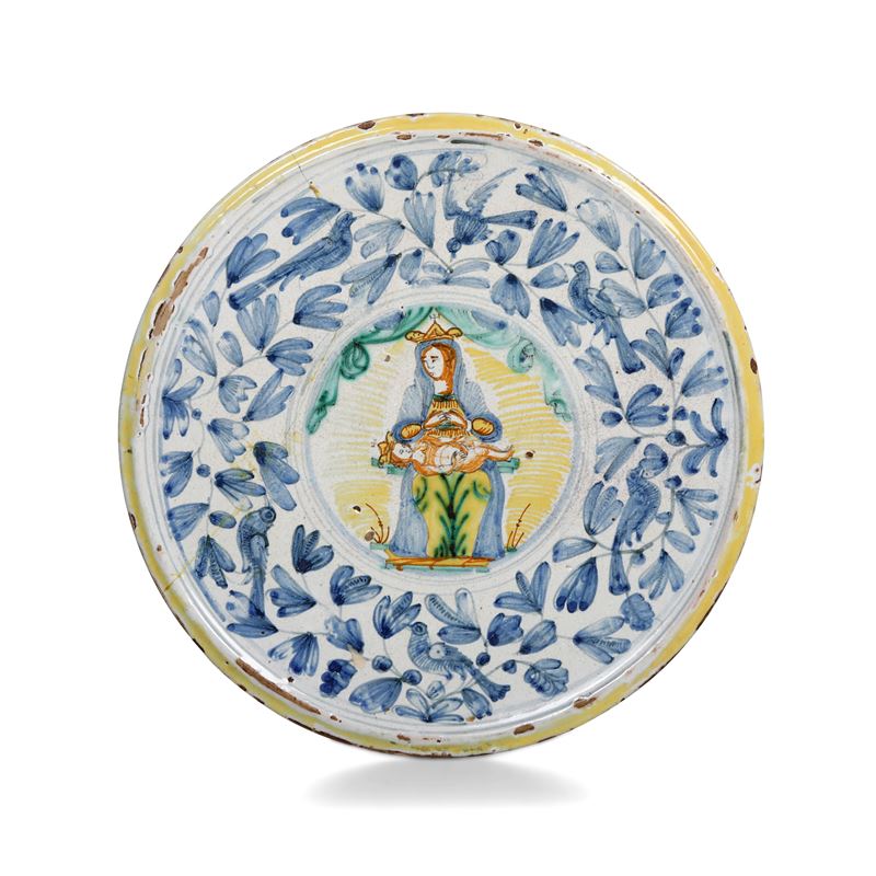 Alzata composta da un tondo, dal bordo rilevato, col piano leggermente incurvato, su piede modellato al tornio e interamente rivestito di smalto stannifero, decorata in policromia a gran fuoco. Nel disco centrale Maria Incoronata, è seduta con Gesù bambino sdraiato sulle sue gambe, in un alone raggiato in giallo. Attorno corre un’ampia fascia in monocromia blu di steli fogliati abitati da uccellini. Lo stile pittorico permette di assegnarlo con certezza alla produzione derutese del Seicento