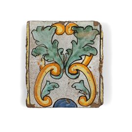 Questa mattonella da bordura fa parte di una serie che forma un nastro incorniciato da due righe gialle, al cui interno si trovano foglie di acanto verdi che si diramano da un nastro a volute ocra e giallo su fondo bianco