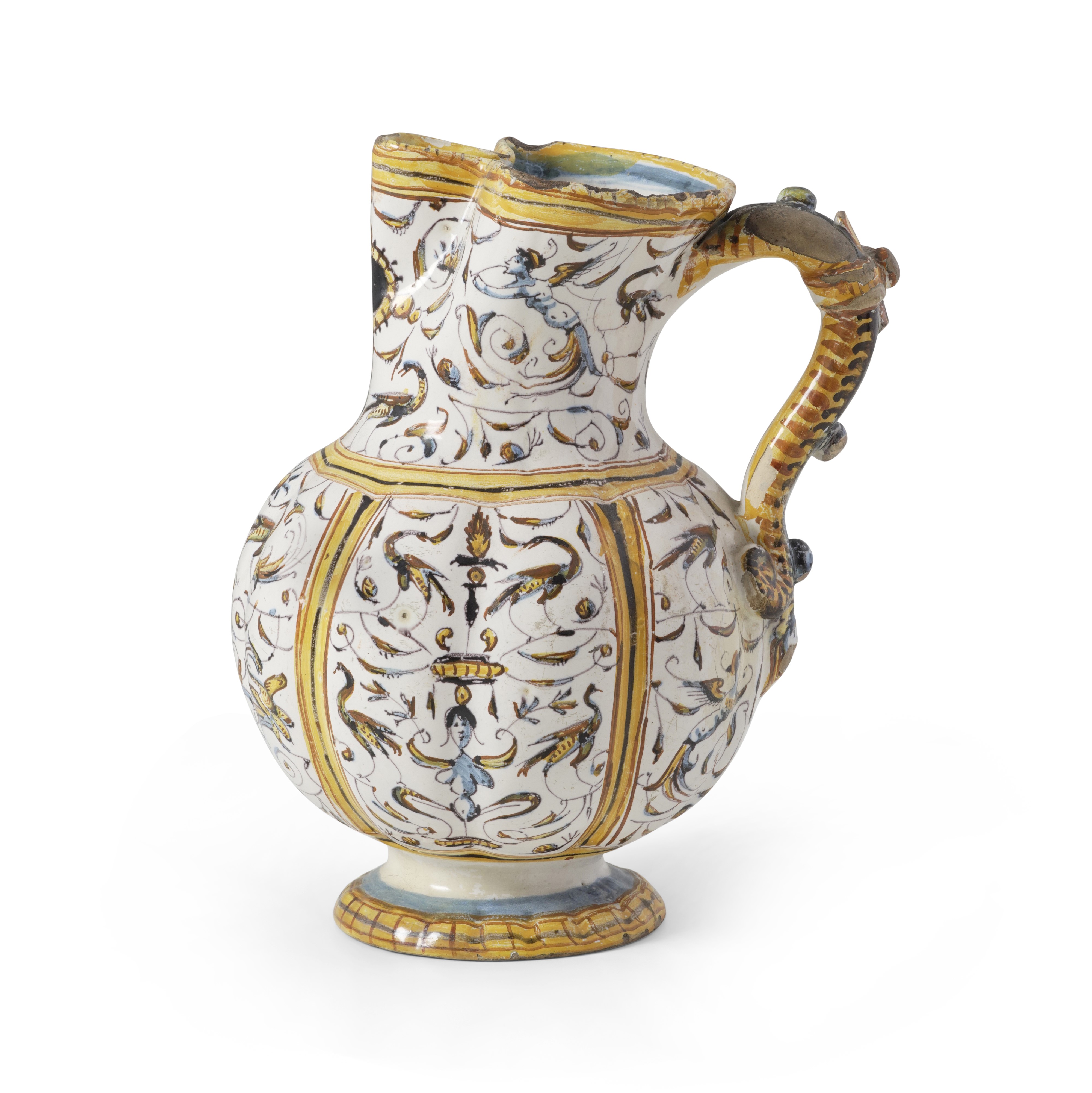 Boccale con ventre sferoidale e sfaccettato con larghe baccellature, collo ad alta parete svasata e bocca trilobata; il piede è ampio e svasato, mentre il manico è di robusta struttura composta da due cordoli serpentiformi, poggianti inferiormente su un piccolo mascherone a rilievo; gli stessi inoltre sono affiancati e uniti da una fascetta e ornati con due piccole sfere a rilievo. La superficie del ventre è partita in larghi settori verticali entro cui si dispone una simmetrica decorazione “a grottesche”, con arpie, uccelli acquatici, delfini, bacili con pomi ecc. La stessa decorazione viene ripresa nella parete del collo e frontalmente include un medaglione a cammeo su fondo nero; strette fasce e filettature corrono sia lungo il piede sia all’orlo della bocca. Dipinto in arancione, azzurro, giallo e nero