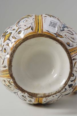 Maiolica. Altezza cm 25,5. Conservazione: diverse sbeccature e cadute di smalto, alcune riprese in vecchio restauro, rottura al bordo della base ricomposta in restauro