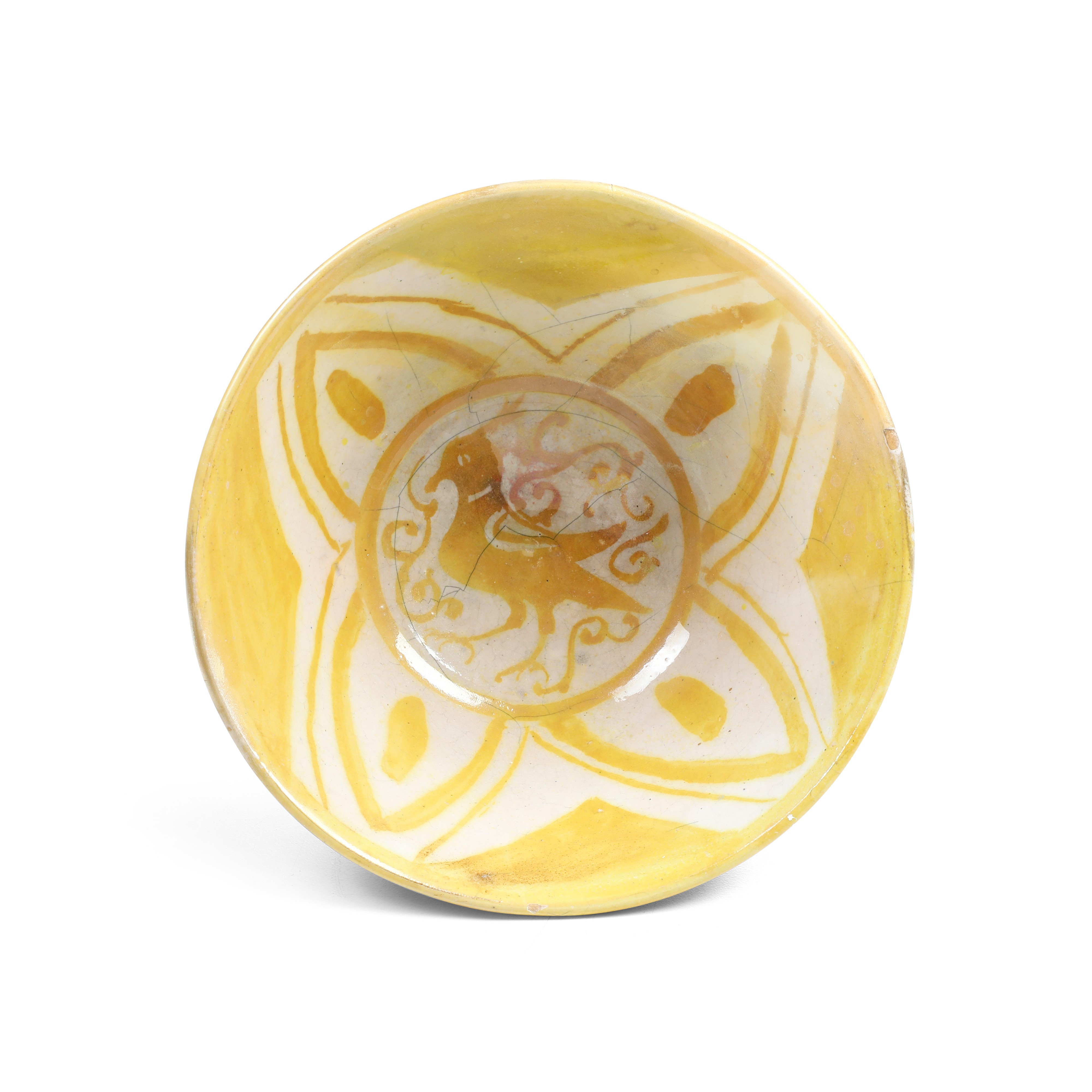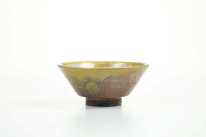 La ciotola, dalla forma troncoconica con un corto piede, è decorata con lustro giallastro su fondo bianco, e presenta un medaglione centrale che racchiude un uccello tra rami stilizzati. La superficie esterna è percorsa da riserve lobate che contengono tralci vegetali