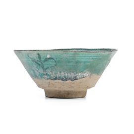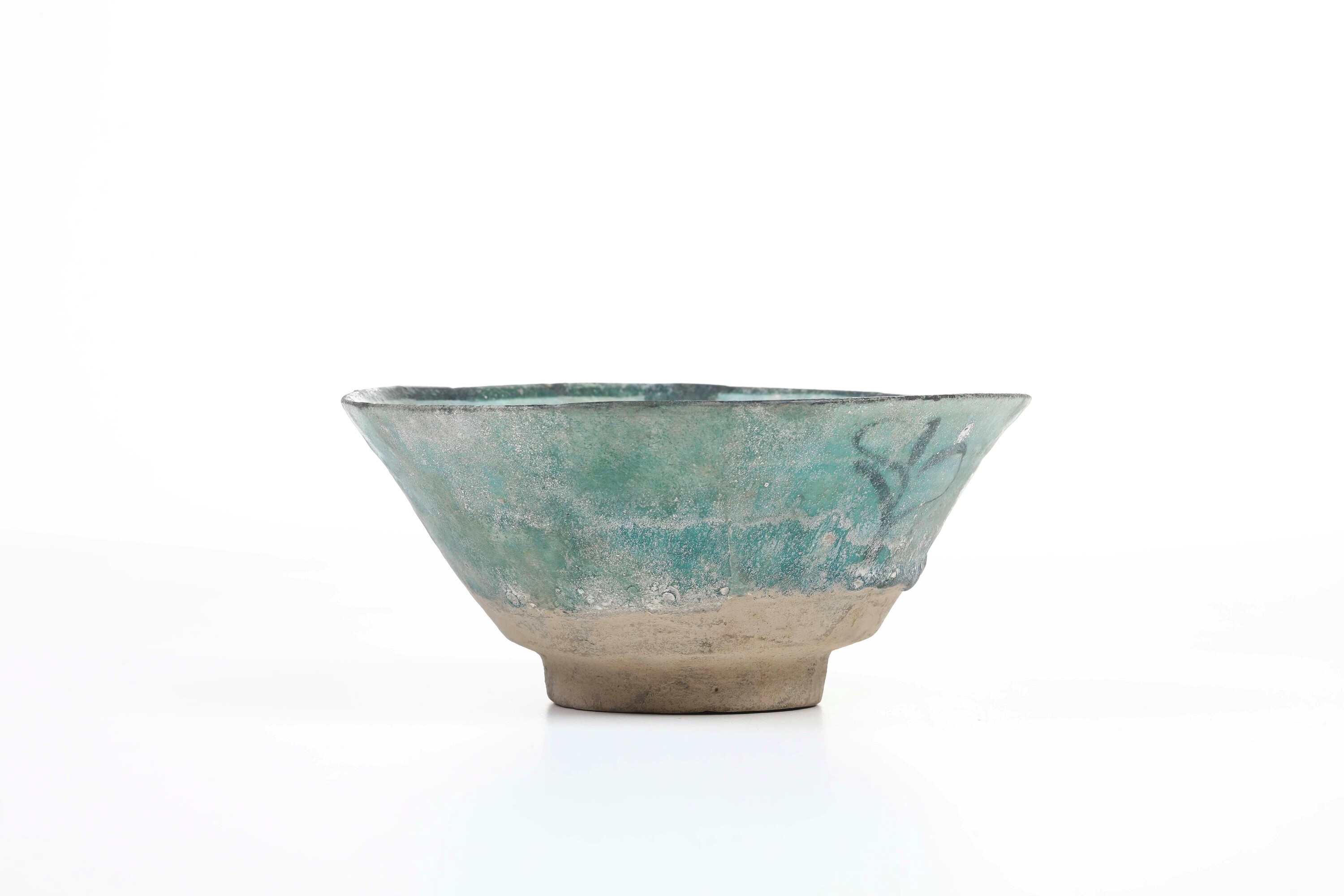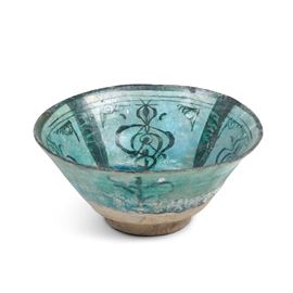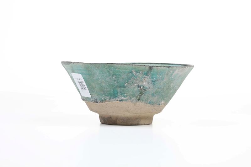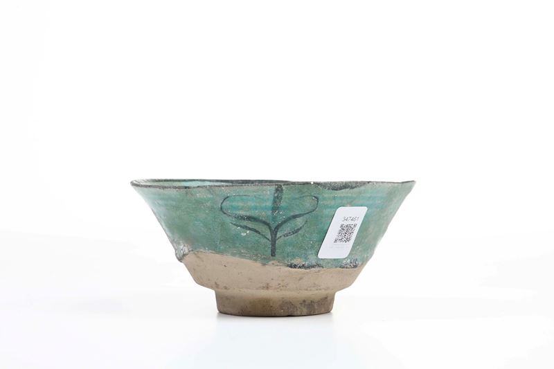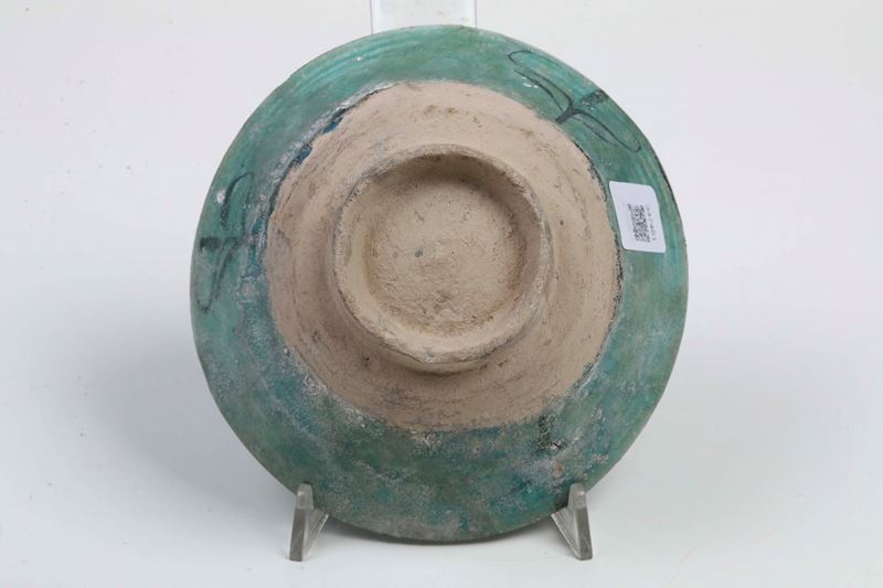 Dalla forma troncoconica è decorata all’interno con motivi vegetali stilizzati e fasce disposti a raggiera, dipinti in nero su invetriata monocroma turchese