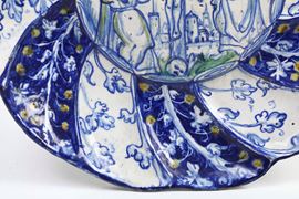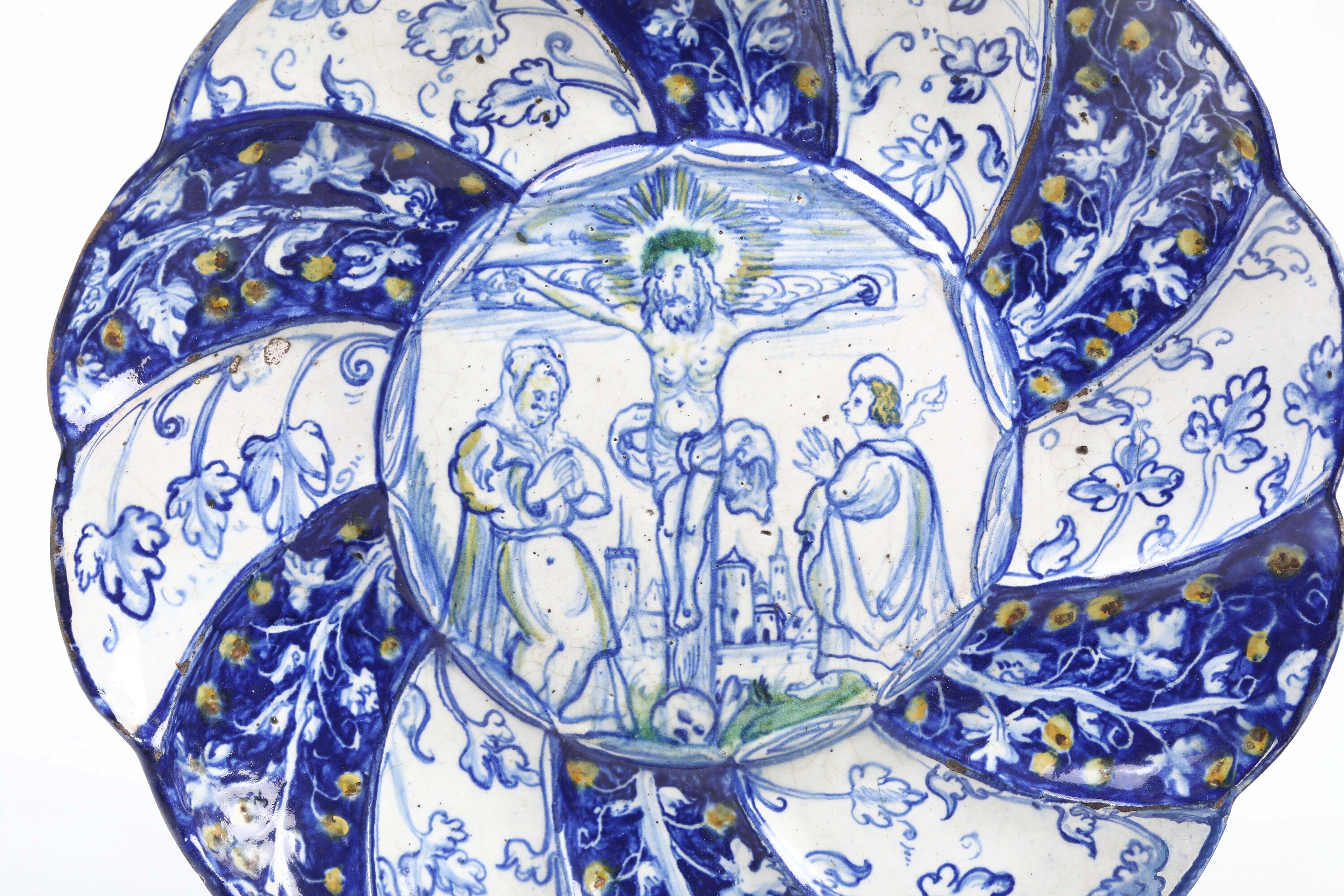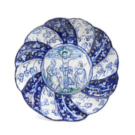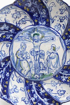 Coppa con parete a larghe baccellature e con basso piede ad anello. Nel recto, al centro dell’umbone è dipinta la “Crocifissione”, con la Vergine e San Giovanni accanto alla croce; sullo sfondo si intravede una città, con torri e campanili. Attorno, nella tesa, si dispongono delle partizioni definite dalle baccellature, che racchiudono tralci di quercia stilizzati, su fondo in bianco e blu alternati, nel genere detto “a quartieri”. Sul verso la superficie è smaltata e presenta delle macchie di colore blu. Dipinta in azzurro e con tocchi di giallo nelle bacche e di verde espanso solo in taluni dettagli della scena