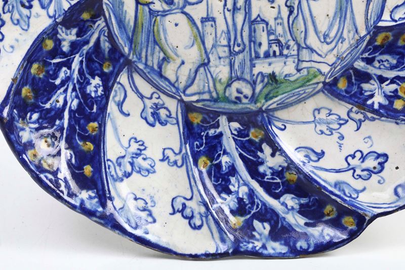 Infine, altro aspetto assolutamente da considerare, specie per la datazione dell’opera, è la scelta della decorazione “a quartieri”, probabilmente ispirata a quella che a Faenza si attesta verso il terzo decennio del Cinquecento. Non meno interessante è la decorazione a tralci di foglie di quercia stilizzate, che invece richiama le “cerquate” roveresche in uso in ambito urbinate intorno al 1540: due ambiti italiani sui quali si alimentò il genere istoriato a Montelupo