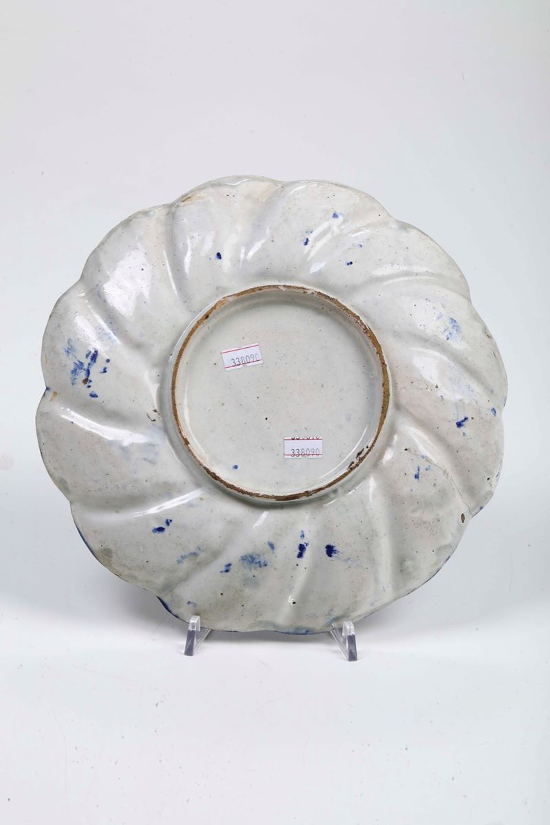 Maiolica. Dimensioni: altezza cm 4; diametro cm 26,7. Conservazione: insignificante felatura allo smalto sul verso alle ore 8; piccolo restauro al bordo alle ore 11; insignificanti usure allo smalto