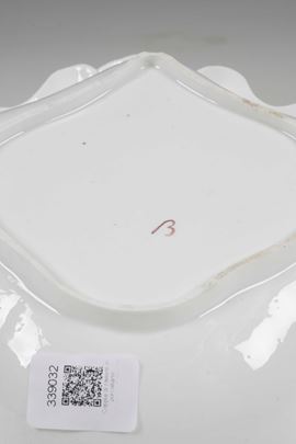 Porcellana. Marca: “B” in porpora. Dimensioni: altezza cm 5,5; cm 23,5x23. Conservazione: usure all’oro.