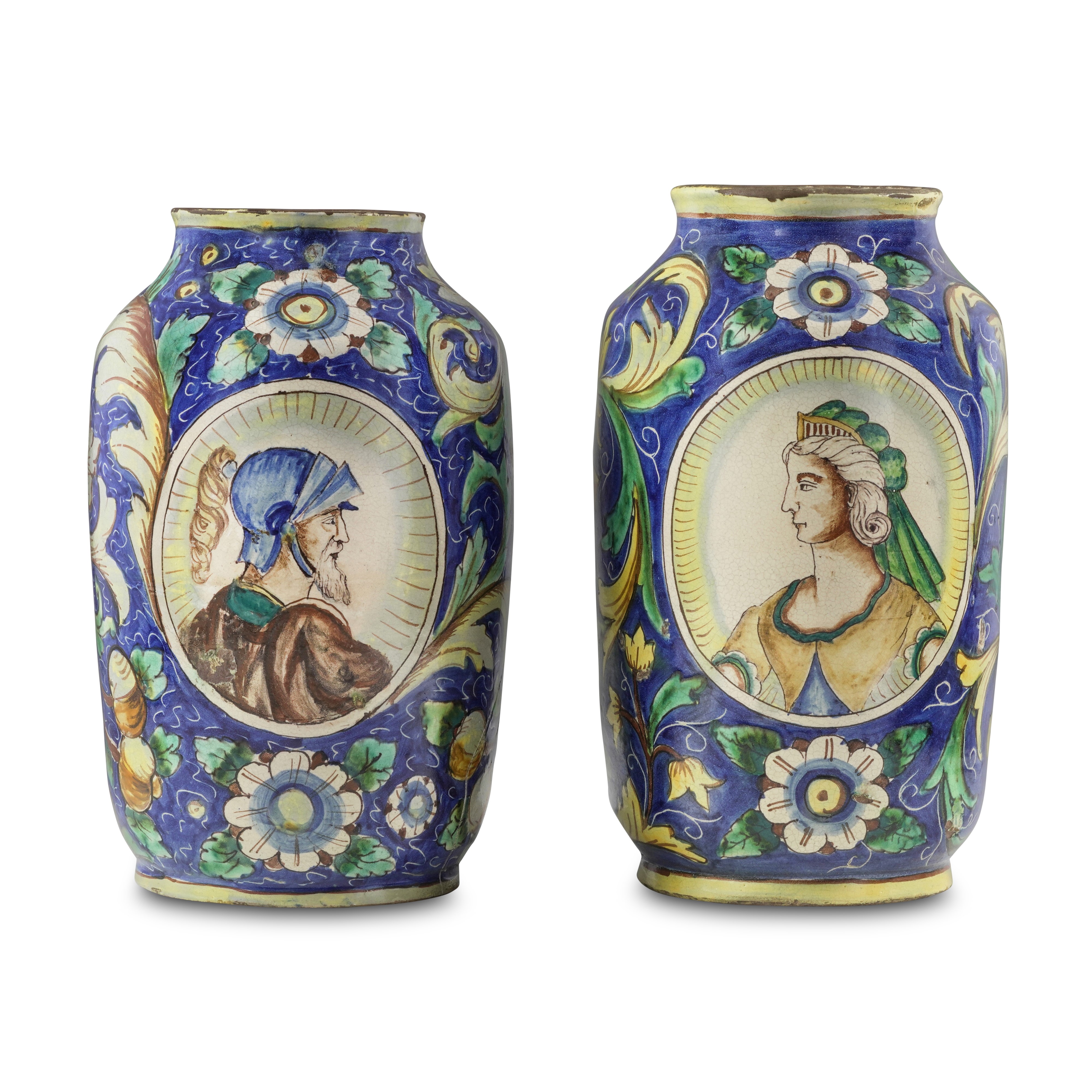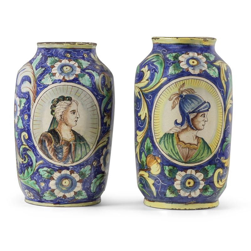 Due albarelli in maiolica con un decoro floreale riservato su fondo blu, con quattro medaglioni ovali che ospitano i busti di profilo di dame e di guerrieri. La formula decorativa è ispirata al motivo “alla veneziana” diffuso in Sicilia dal Seicento
