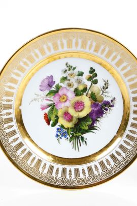 I piatti, dal bordo liscio, presentano al centro un bouquet di fiori policromi, mentre le tese sono impreziosite da un nastro dorato con motivi vegetali stilizzati, secondo la moda dell'epoca