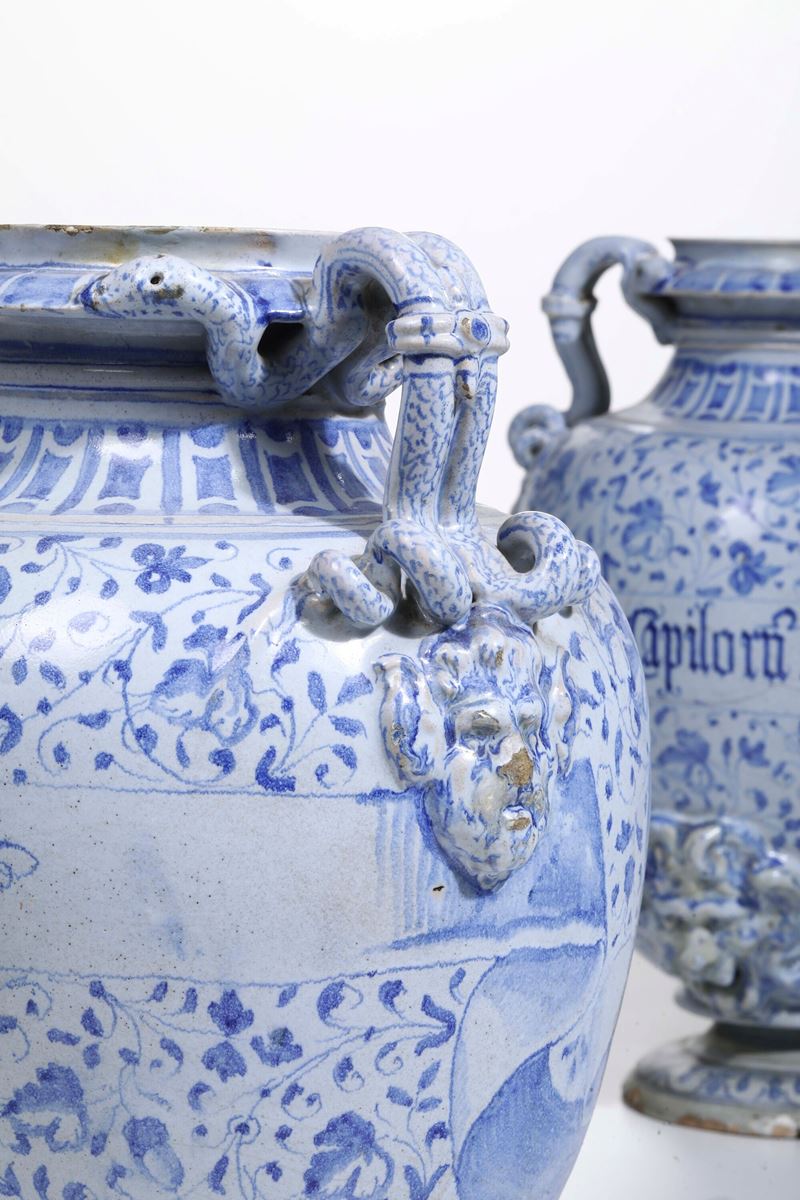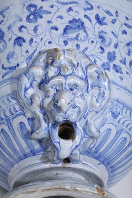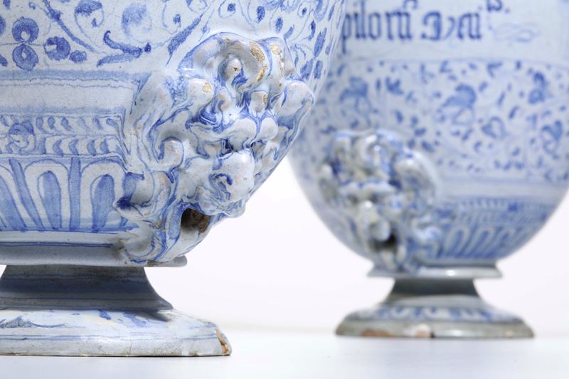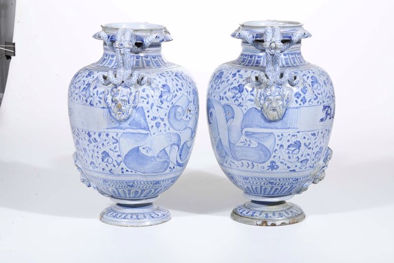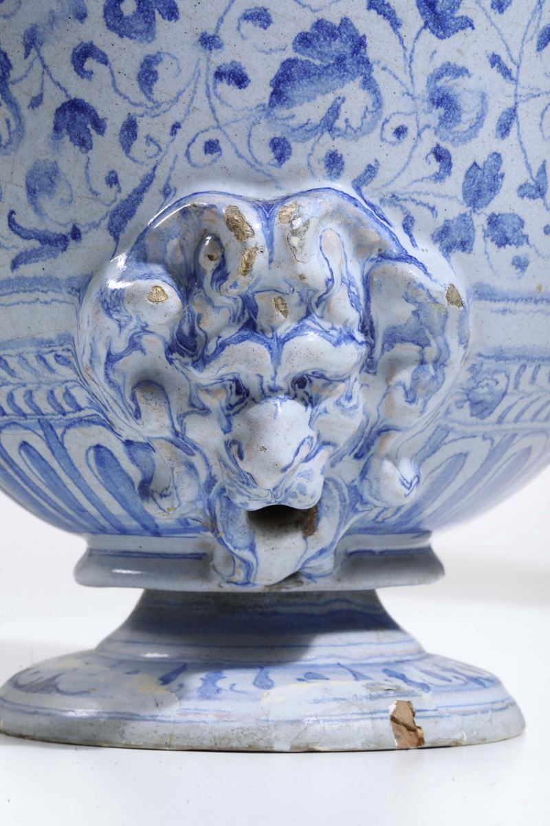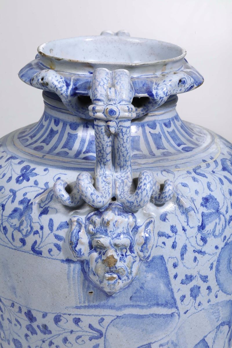 Maiolica. Marca: assente. Altezza cm 41 circa. Conservazione: buona; restauri al bordo dei piedi; un pezzo con felatura sulla spalla; cadute di smalto ai mascheroni e a un manico di cui alcuni ripresi in vecchio restauro