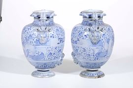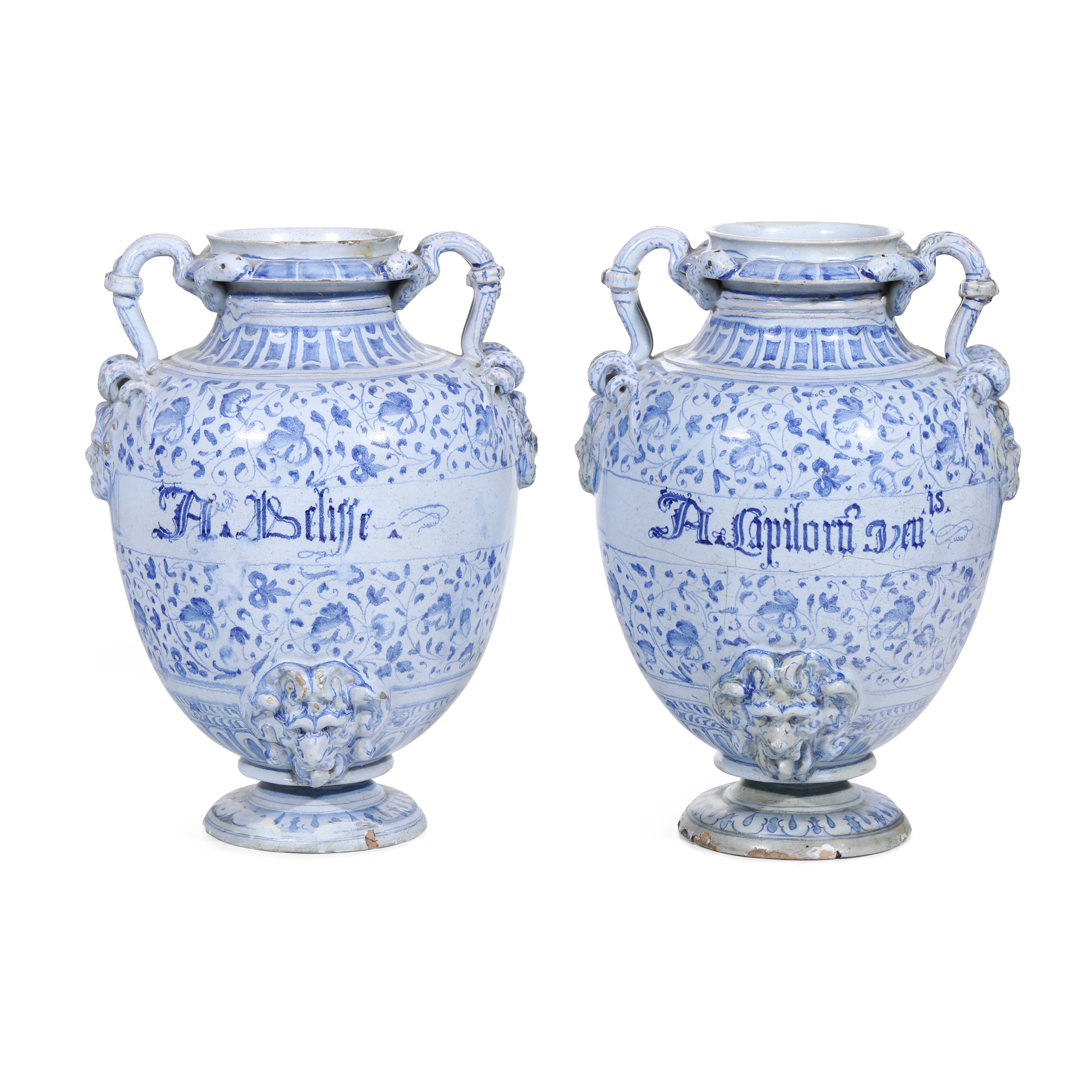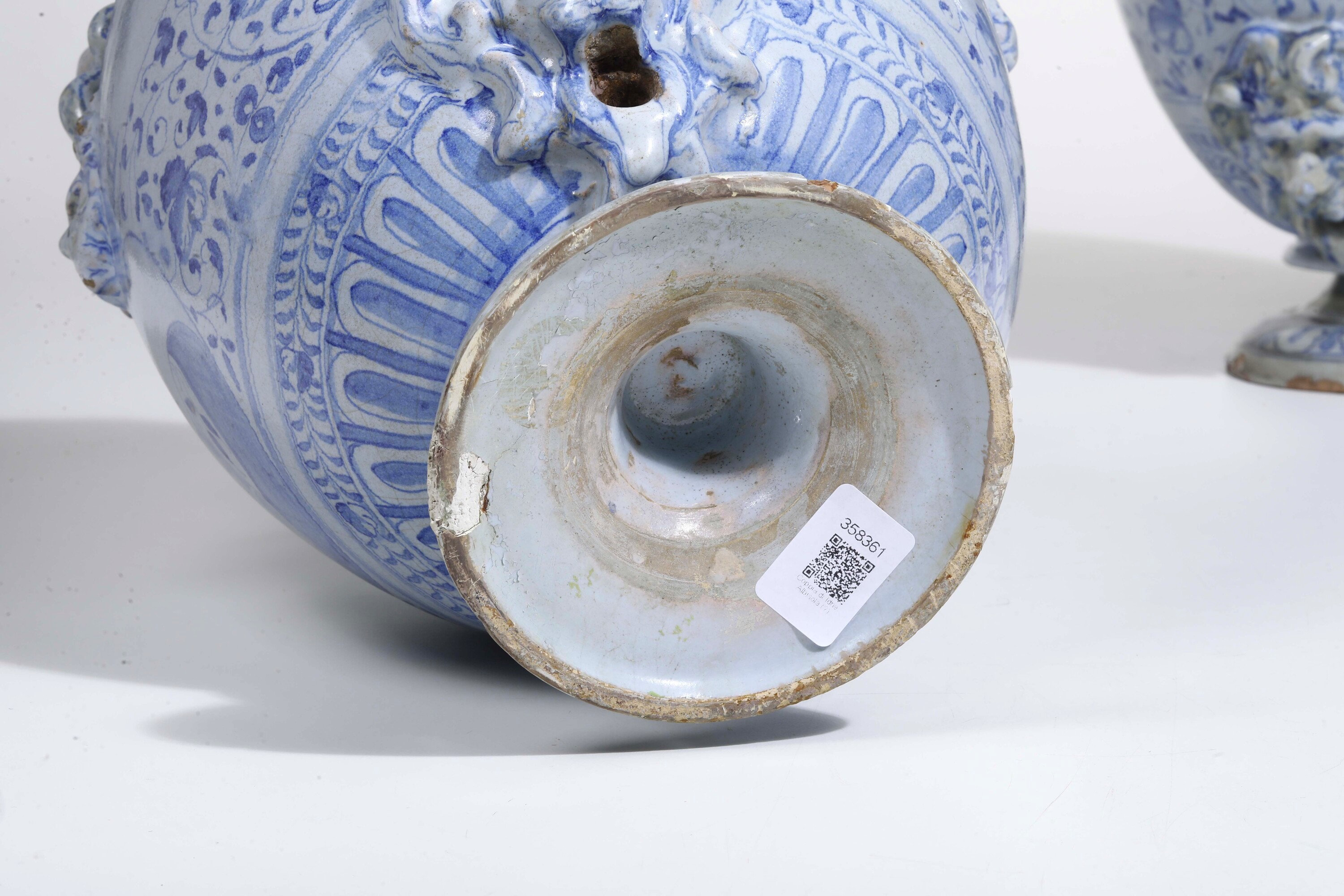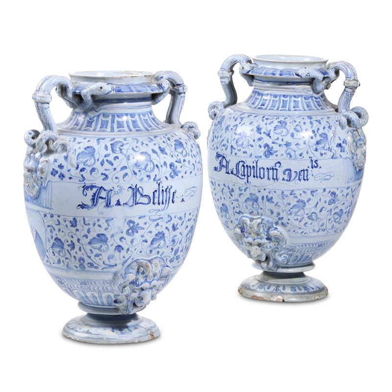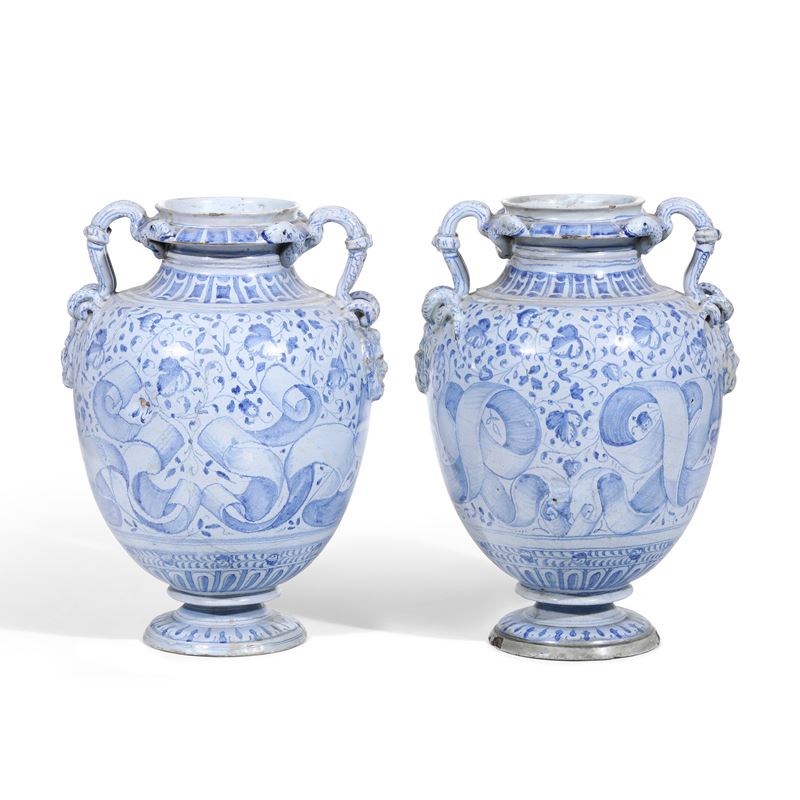 Maiolica. Marca: assente. Altezza cm 41 circa. Conservazione: buona; restauri al bordo dei piedi; un pezzo con felatura sulla spalla; cadute di smalto ai mascheroni e a un manico di cui alcuni ripresi in vecchio restauro