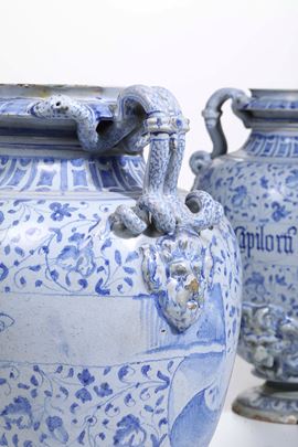 Le due anse sono fissate su punti opposti della superficie del contenitore, al confine tra la spalla e la base del collo, ciascuna plasmata nella forma di una coppia di serpi accostate che posano le teste sulla gronda e inarcano la parte superiore del corpo, ognuna volgendo in direzione opposta rispetto all’altra; le parti centrali dei corpi rimangono unite, costrette da un nastro, favorendo la presa; le code invece divergono e attorcono le spire lungo la superficie del vaso, a contatto della testa del mascherone zoomorfo sottostante, posto a rinforzo della parete vasale. Il terzo mascherone protegge come d’uso il foro praticato al centro della parte più declive della parete, dove trovano sede la spina o il rubinetto regolatori del flusso del medicinale.