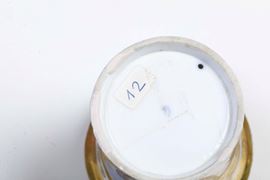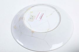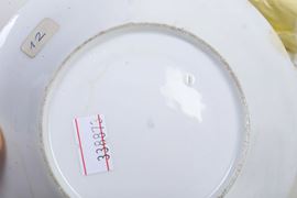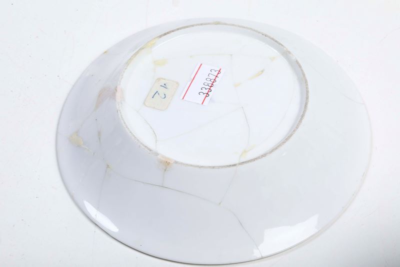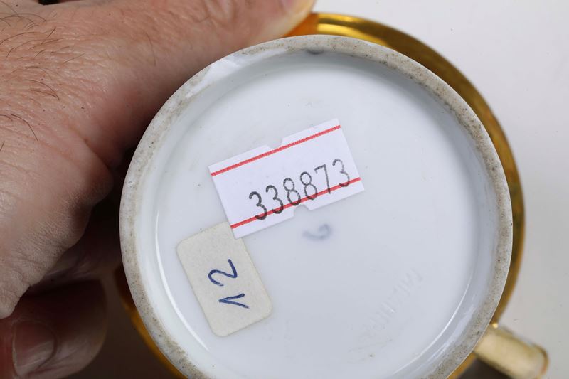 Porcellana. Marca: "G" in blu; scritta in cirillico impressa. Dimensioni: altezza tazza cm 9 circa; diametro piattino cm 13 circa. Conservazione: tazze e piattini rotti in più frammenti e ricomposti in restauro