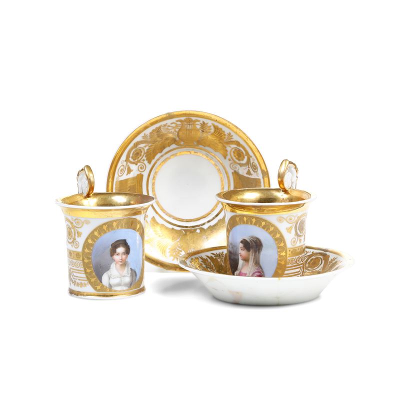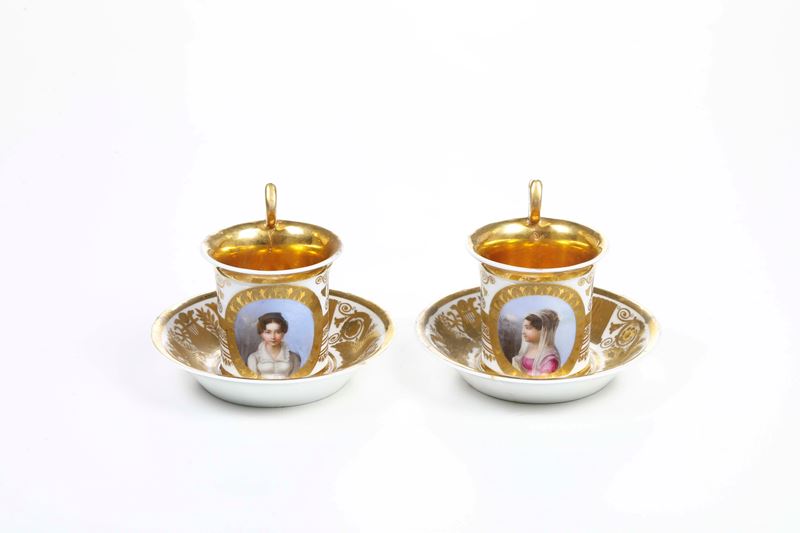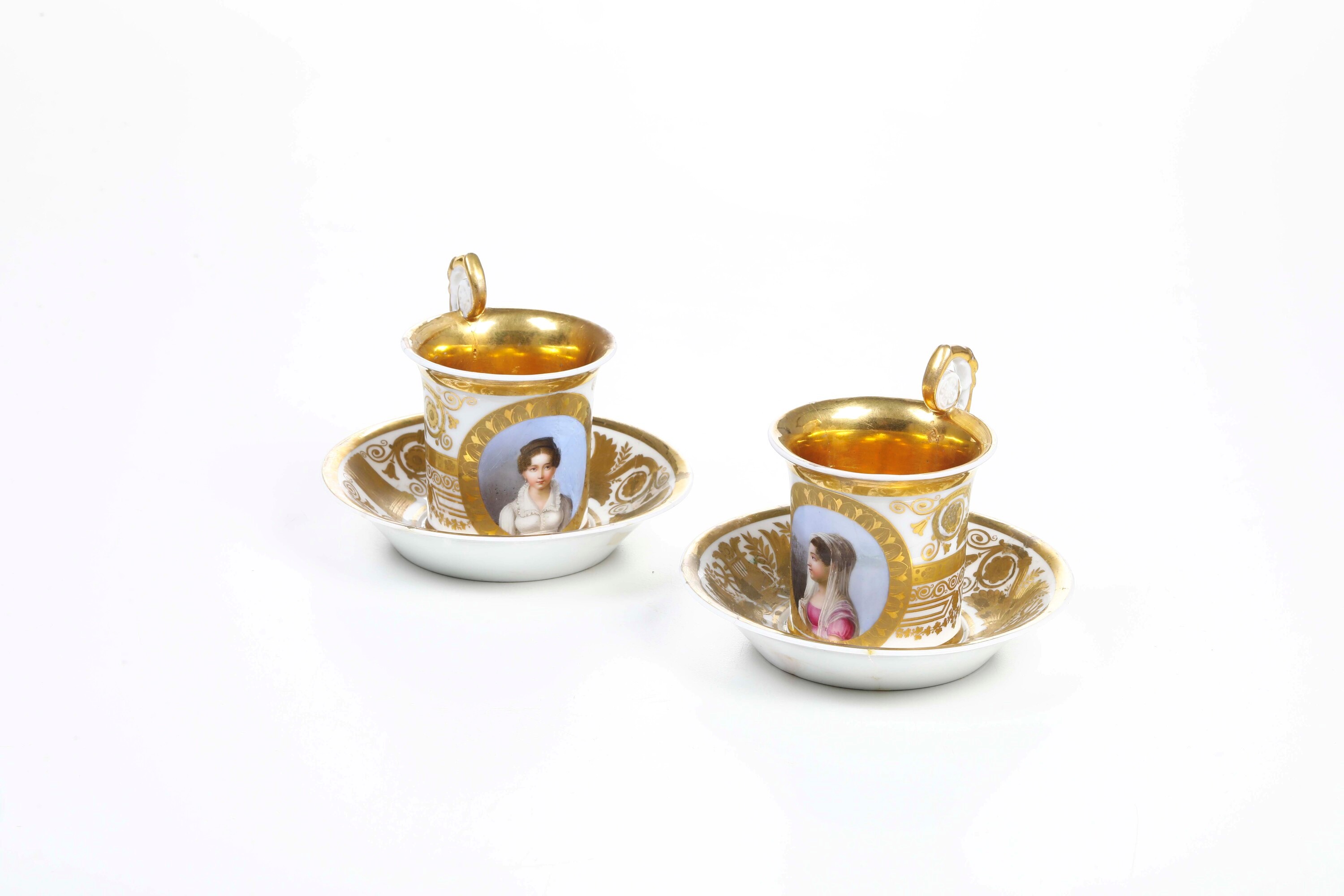 Le tazze cilindriche presentano un bordo superiore leggermente svasato, un alto manico a rosetta e una ricca decorazione composta da un grande medaglione policromo, sul lato frontale, con il ritratto a mezzo busto di giovani aristocratiche. Il resto della superficie è decorato in oro con fasce orizzontali a motivi geometrizzati e a rocailles, i piattini presentano una decorazione dorata corrispondente. L'interno della tazza è dorato