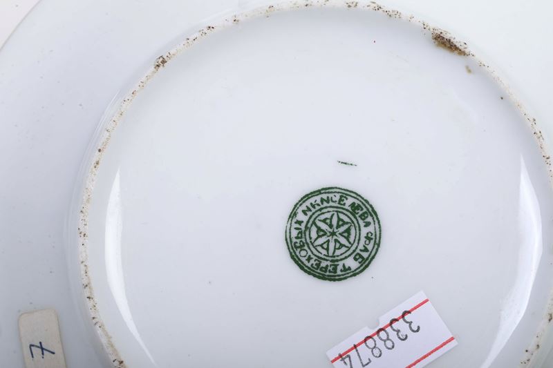 Tazza Retchitski. Marca: simbolo grafico rotondo con caratteri cirillici in verde. Dimensioni: altezza tazza cm 6,2; diametro piattino cm 14,7. Conservazione: sbeccatura al bordo superiore della tazza; piattino con due vecchi restauri al bordo