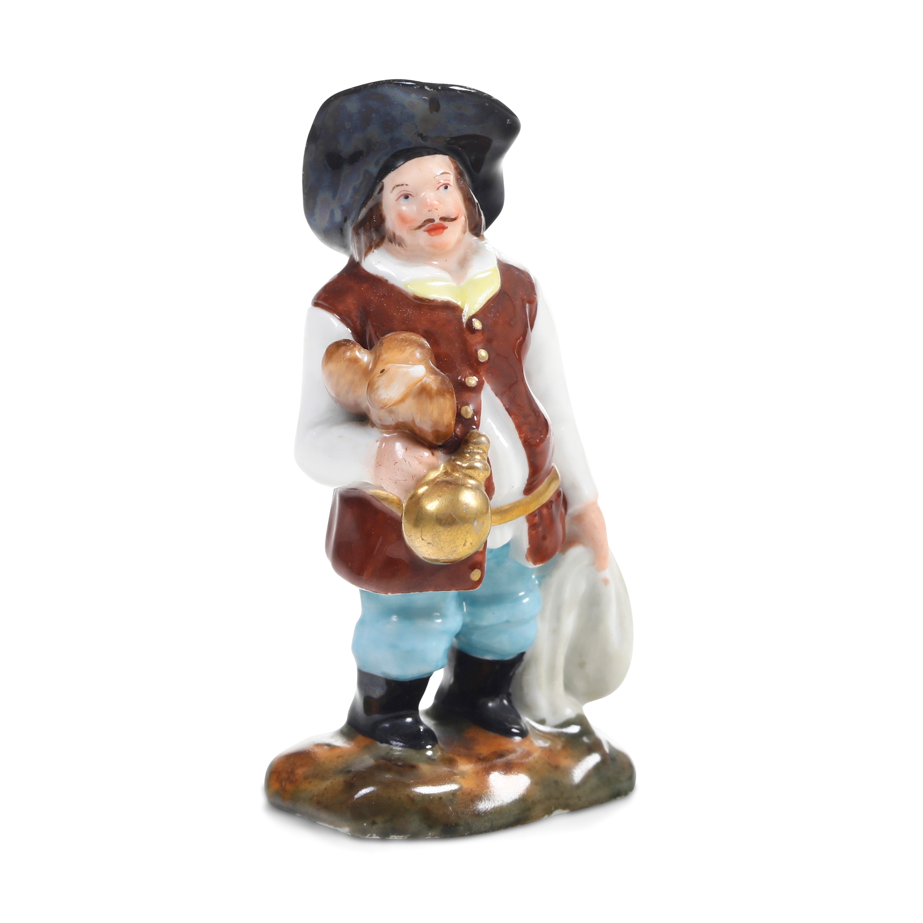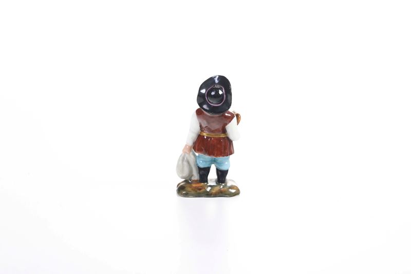 Questa vivace figurina raffigura Sancho Panza, celebre personaggio del Don Chisciotte di Miguel de Cervantes. Raffigurato in abiti popolari, è ritratto in atteggiamento realistico: tiene un'oca sotto il braccio destro, una borraccia appesa alla cintura e un sacco da viaggio nella mano sinistra