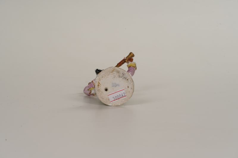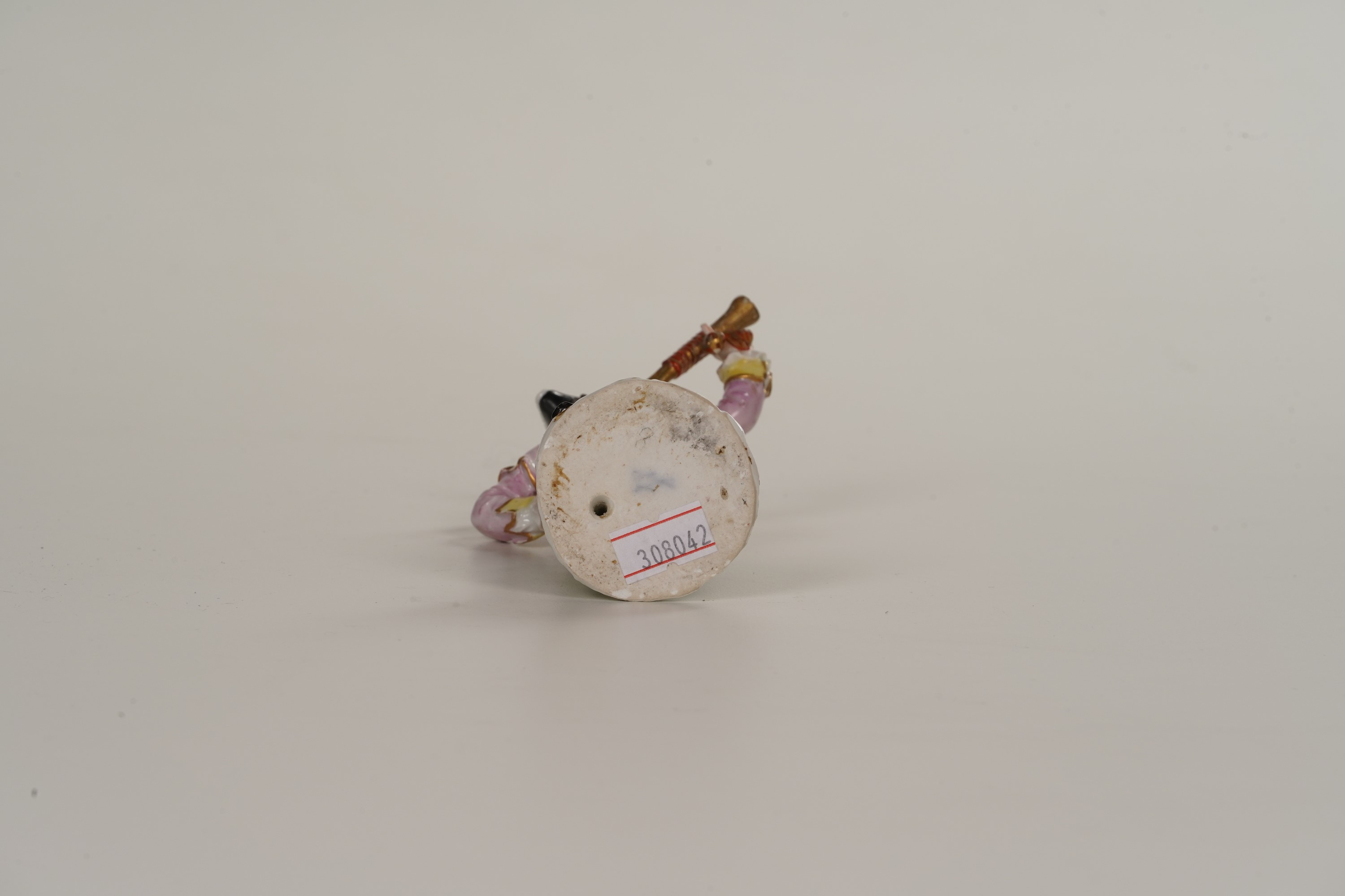 Porcellana. Marca: spade in blu sotto la base. Altezza cm 14,2. Conservazione: buona; restauri al terminale della tromba e alla mano sinistra.