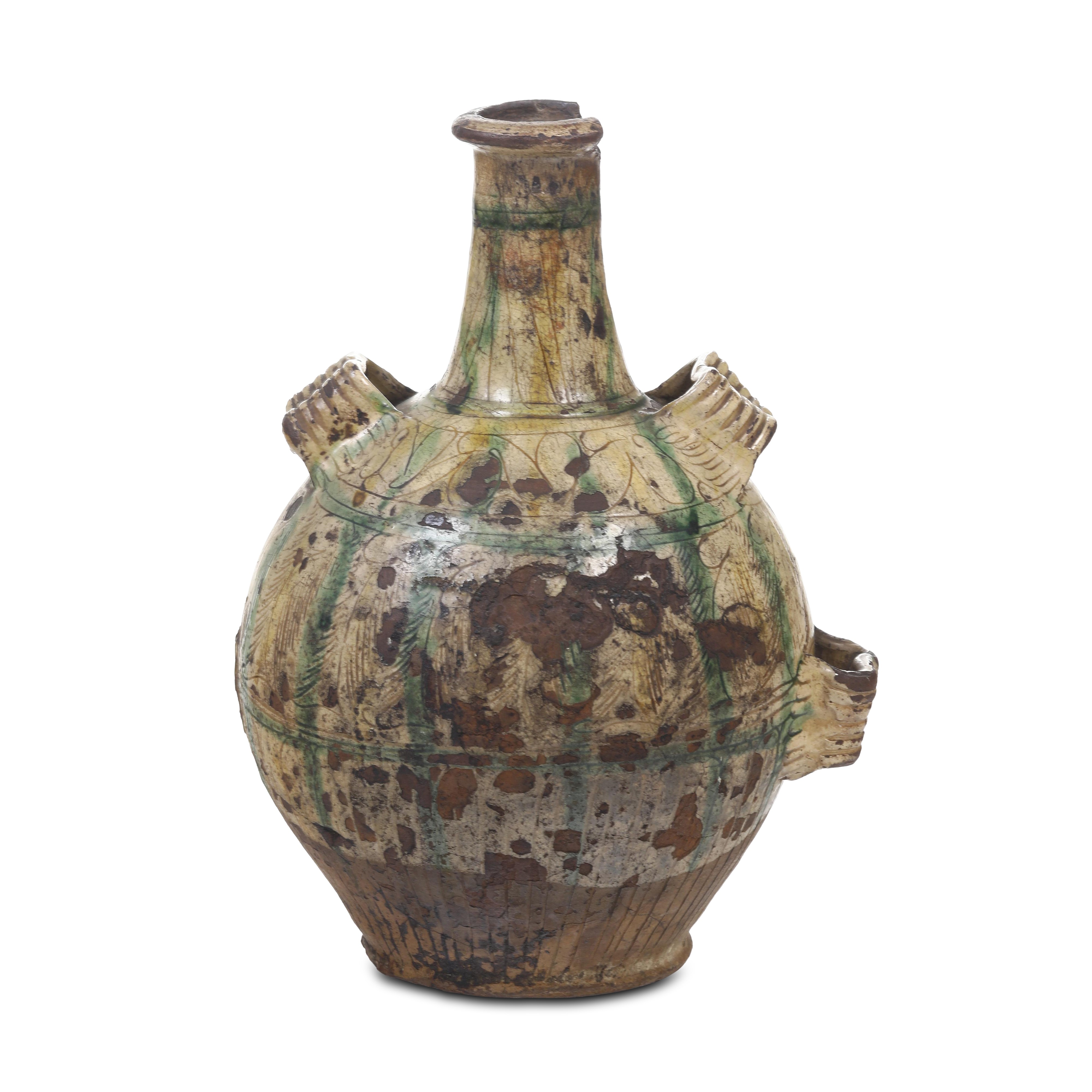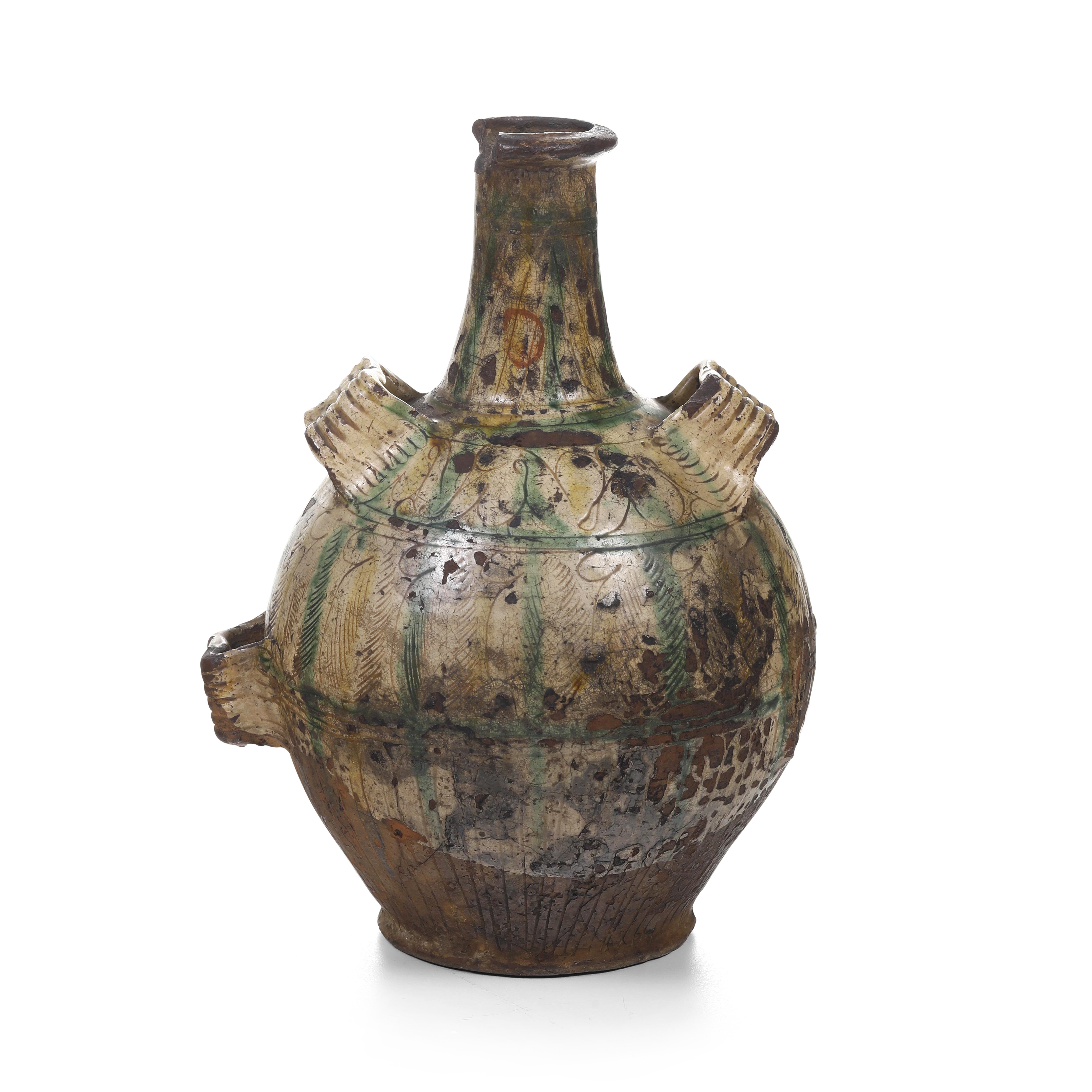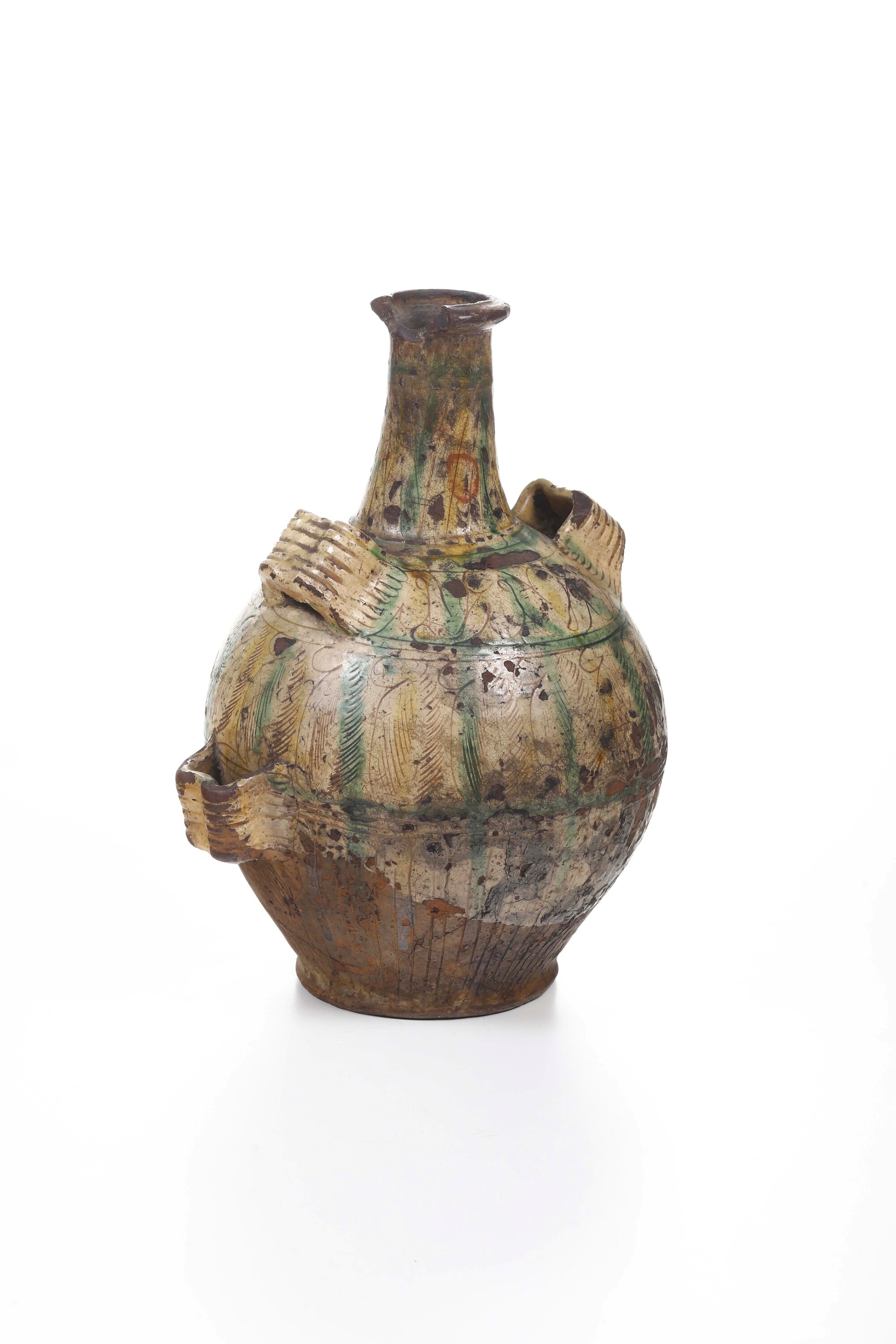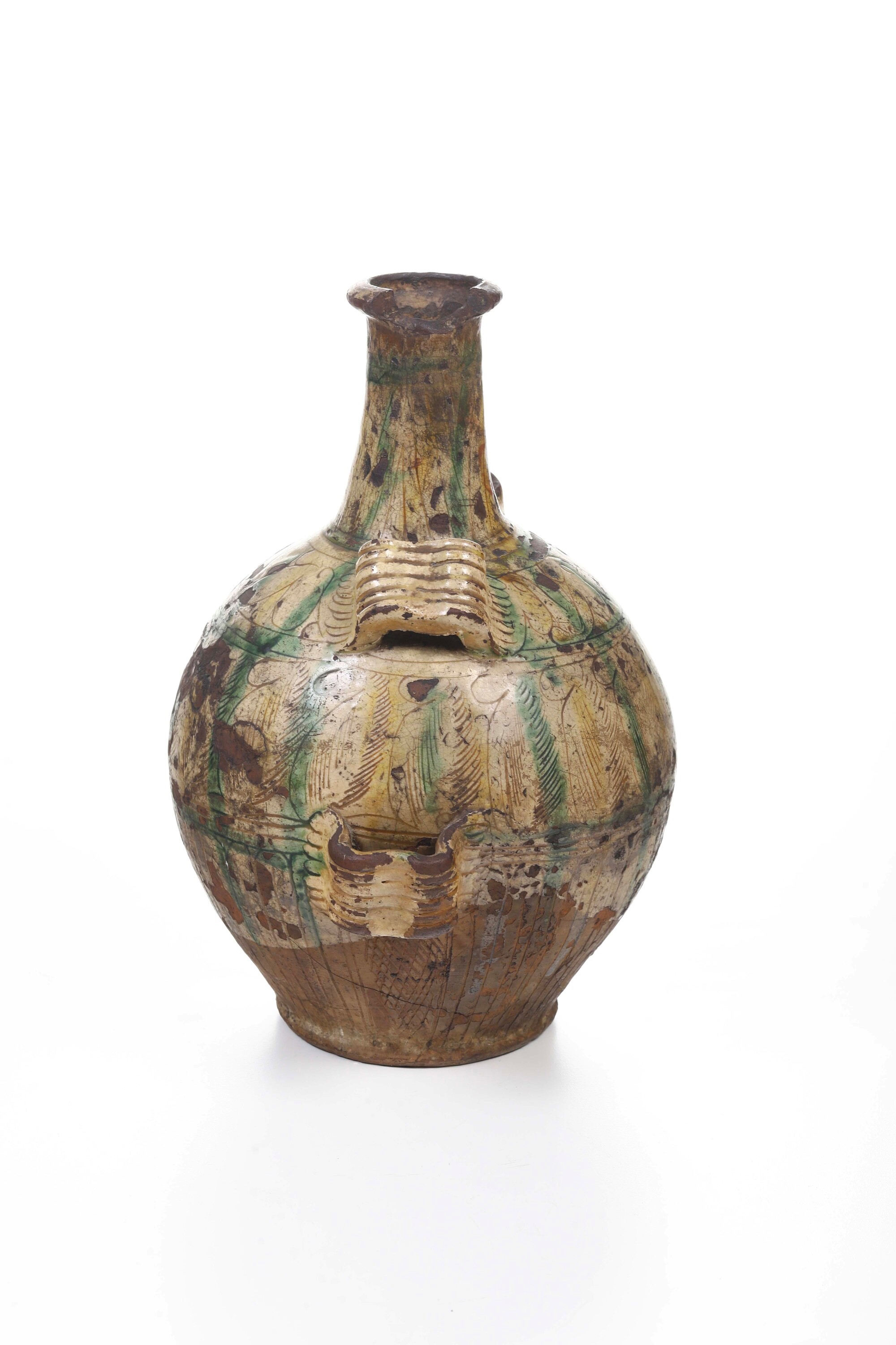 Fiasca da trasporto, dal corpo ovoidale e alto collo troncoconico, con passanti a nastro, modellata in terracotta, ingobbiata, graffita a punta e dipinta con linee colorate in verde ramina e bruno ferraccia. La forma d’uso a borraccia e lo stile decorativo appartiene alla famiglia produttiva emiliana, molto simile a quella documentata a Carpi.