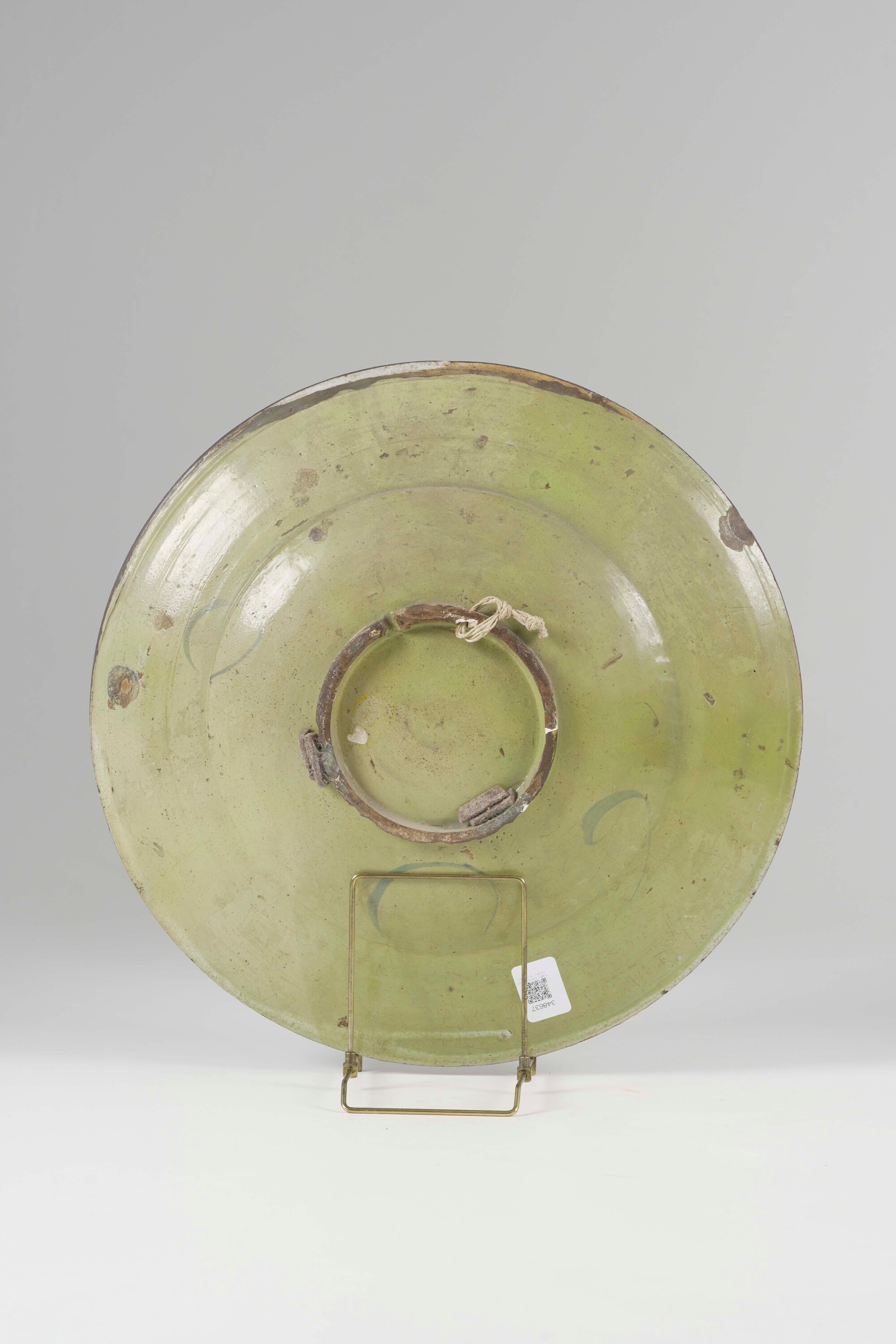 Maiolica. Diametro cm 40. Conservazione: rotto in quattro o più frammenti e ricomposto in restauro