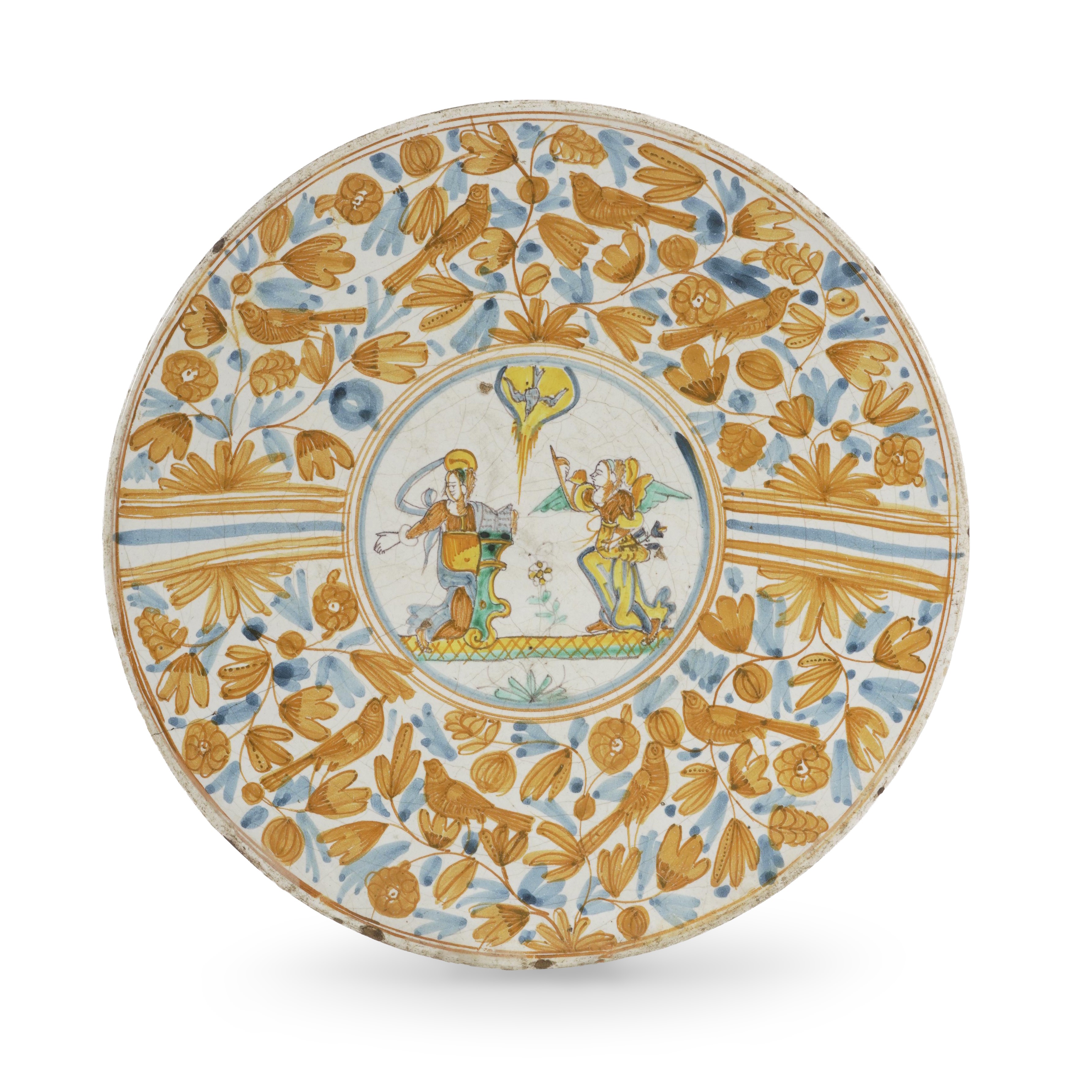 Sul piano del piatto, all’interno di un medaglione circolare, è raffigurata un’Annunciazione. La Vergine a sinistra è inginocchiata in preghiera davanti ad un leggio, tiene il capo e il braccio destro in direzione opposta all’Arcangelo Gabriele che, sulla destra, con una mano impugna un giglio e con l’altra indica in alto verso una mandorla di luce in cui è racchiusa la colomba dello Spirito Santo. Sulla restante superficie si dispone una decorazione di tipo “calligrafico”. Dipinto in arancio, blu, giallo e verde