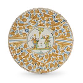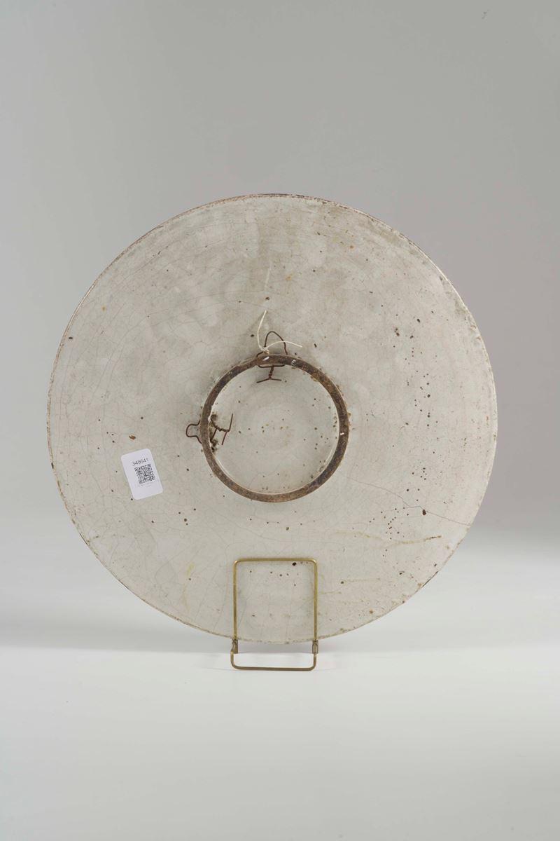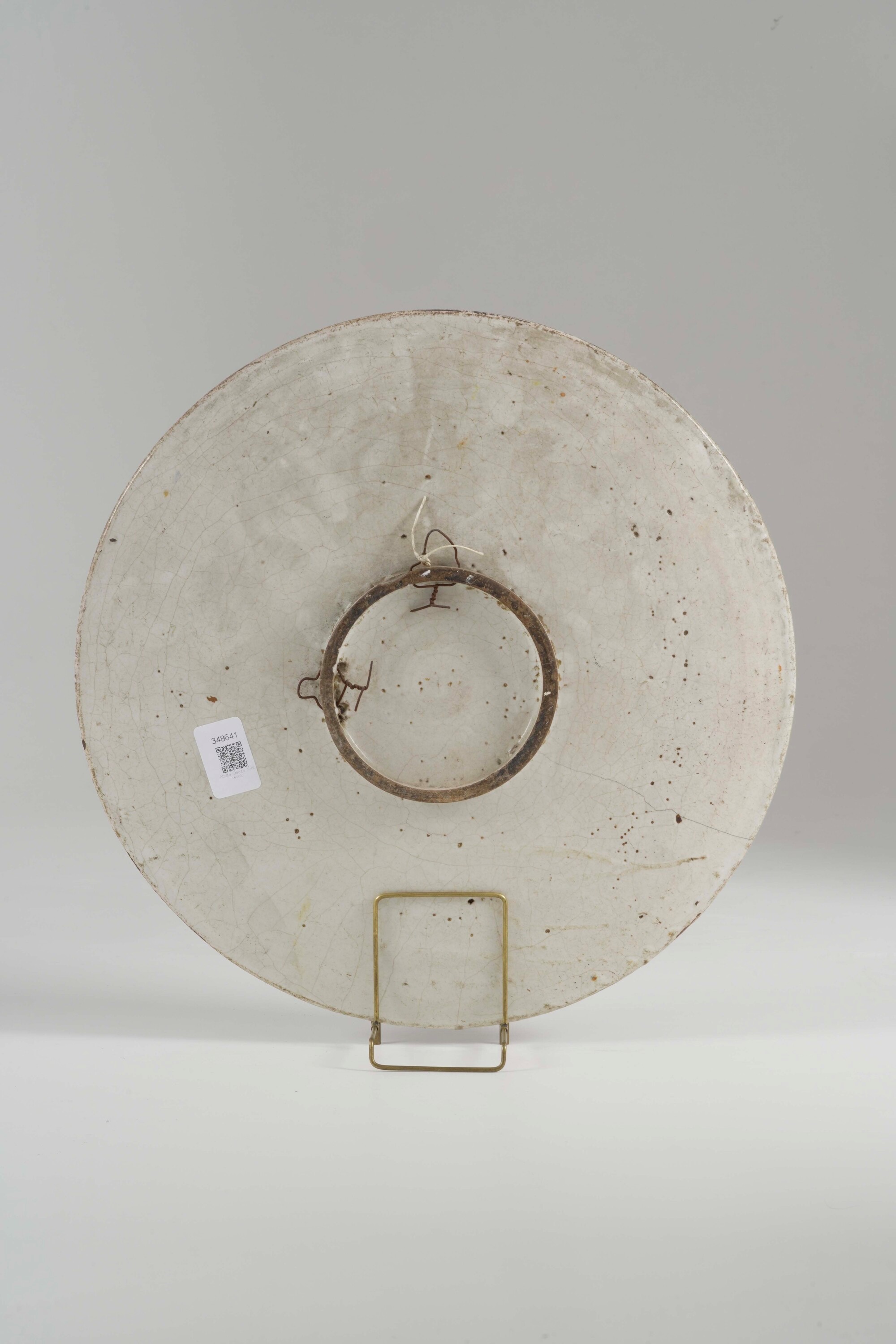 Maiolica. Diametro cm 36, 5. Maiolica. Diametro cm 36,5. Conservazione: una felature alle ore 8 che parte dalla tesa verso il centro; sbeccature minori al bordo; craquelures