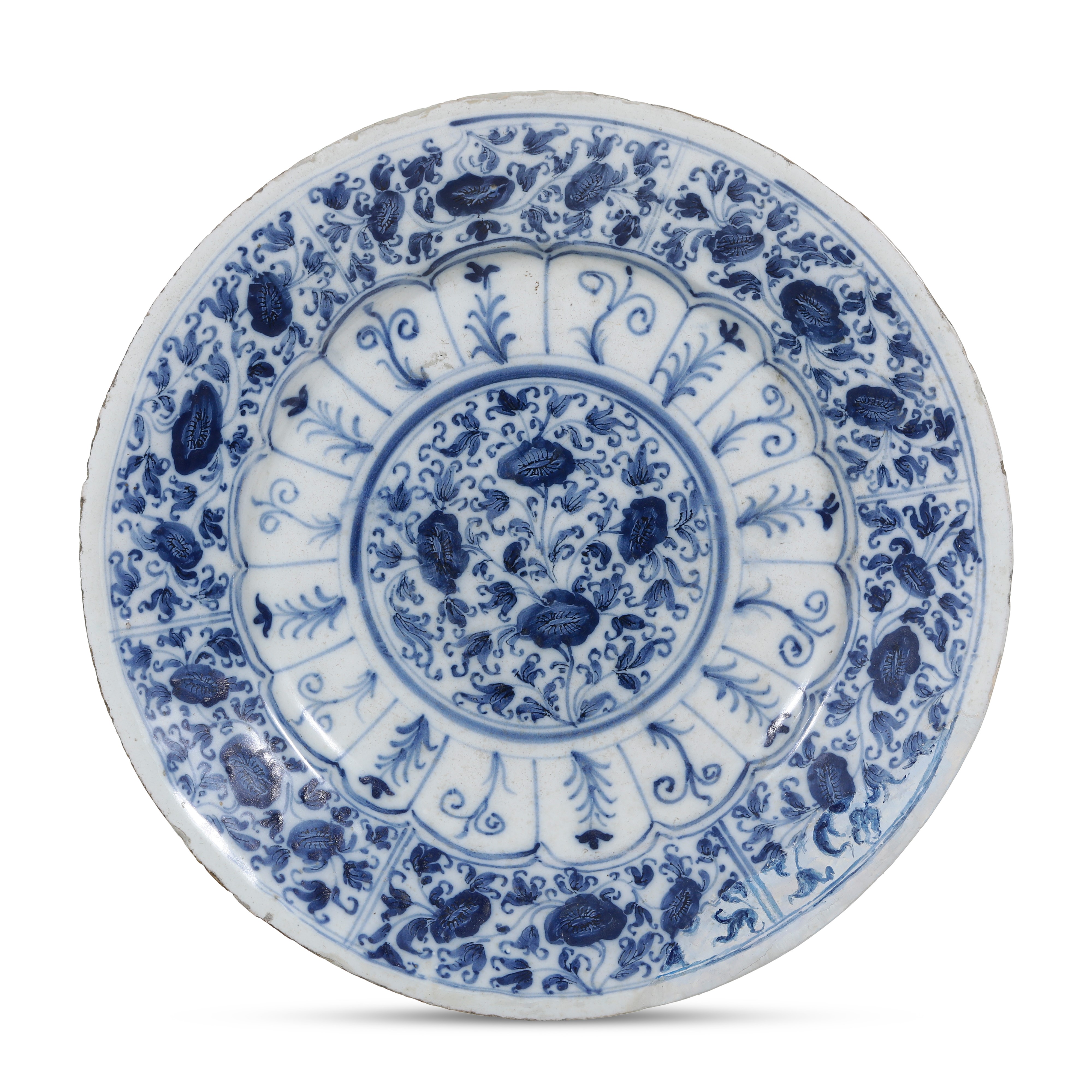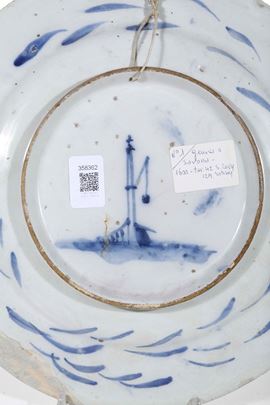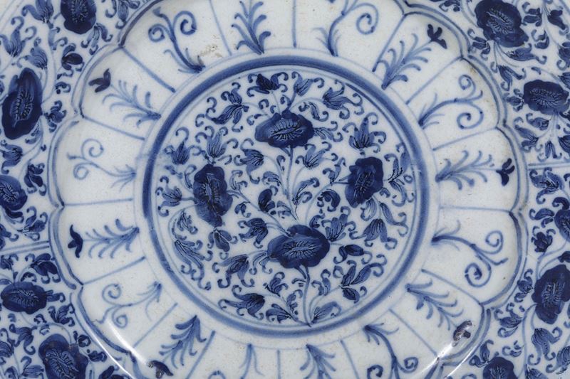 Piatto circolare con ampia tesa, decorato in monocromia blu secondo un repertorio di chiara ispirazione orientale, derivato dalle porcellane cinesi della dinastia Ming. Il cavetto presenta un medaglione centrale ornato da motivi floreali stilizzati. La fascia intermedia è scandita da riserve lobate che contengono racemi e tralci vegetali, mentre la tesa è riccamente decorata con una sequenza continua di elementi fitomorfi secondo un impianto ornamentale “alla porcellana”, eseguito con pennellate sciolte e vivaci, caratterizzata da una resa decorativa elegante