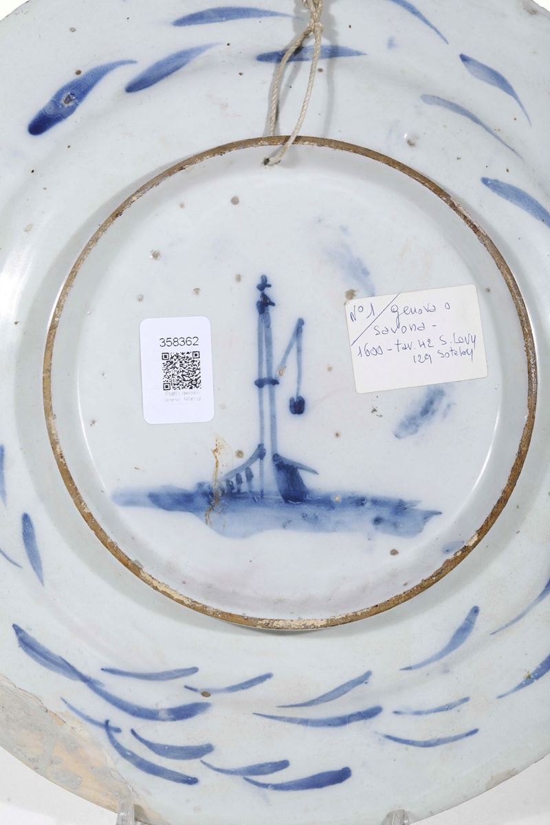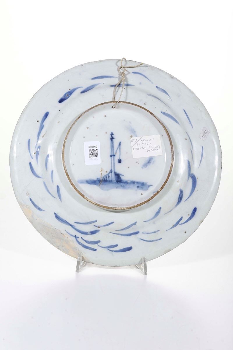 Maiolica. Marca: lanterna. Diametro cm 34,5. Conservazione: piccola parte della tesa integrata tra le ore 4 e le ore 6; piccole sbeccature e usure di smalto al bordo
