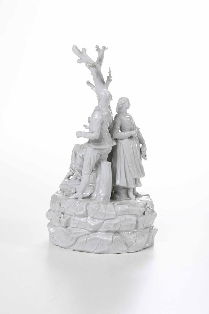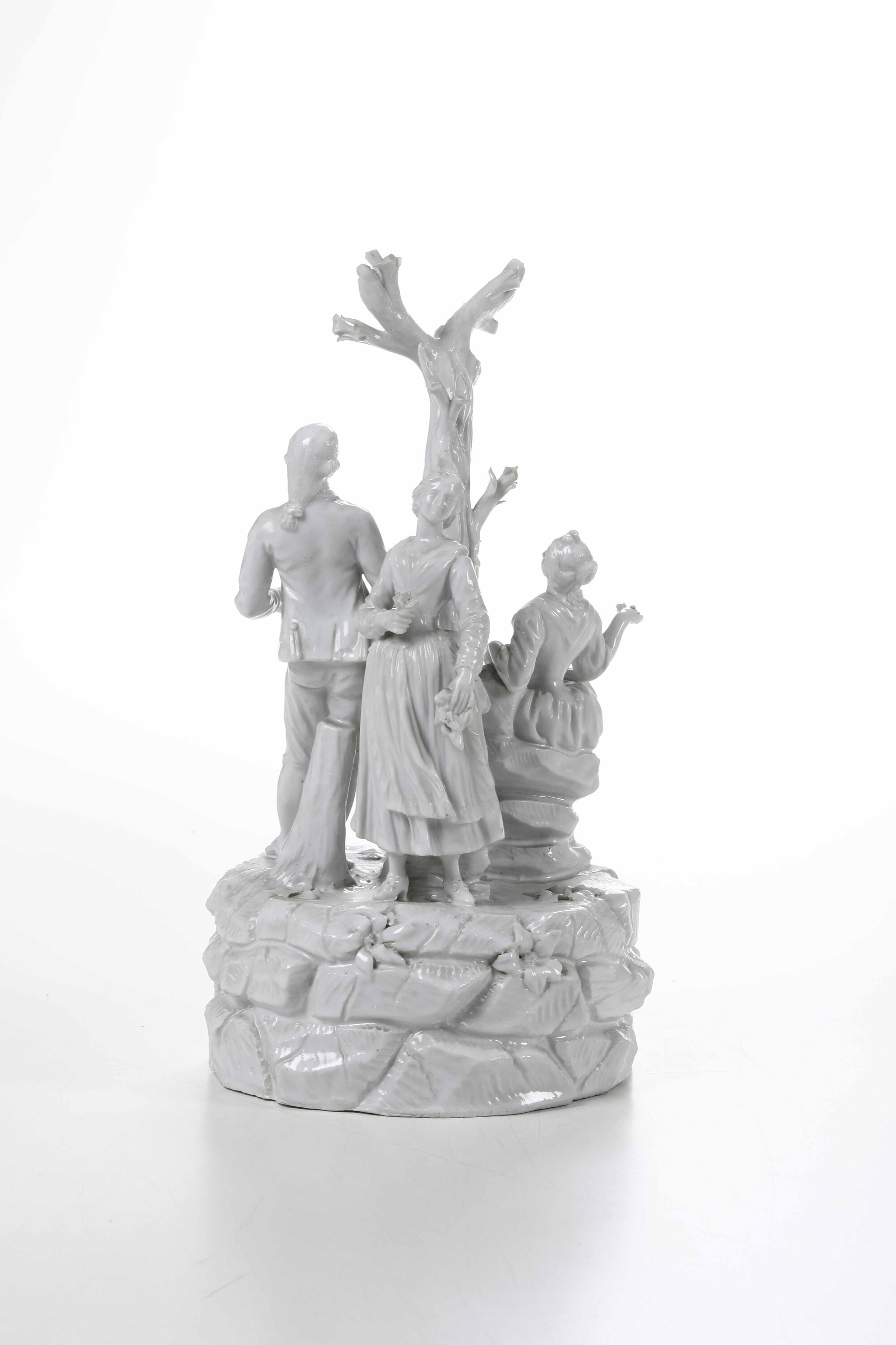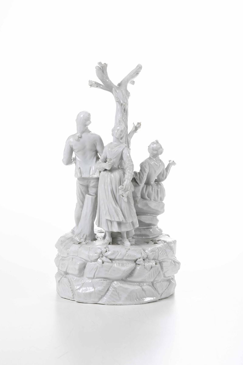 Il gruppo galante raffigura due personaggi maschili ed uno femminile attorno ad un albero su base a massi squadrati. Questa tipologia di gruppi nasce per la decorazione delle tavole che posti al centro potevano essere osservati da tutti i lati.