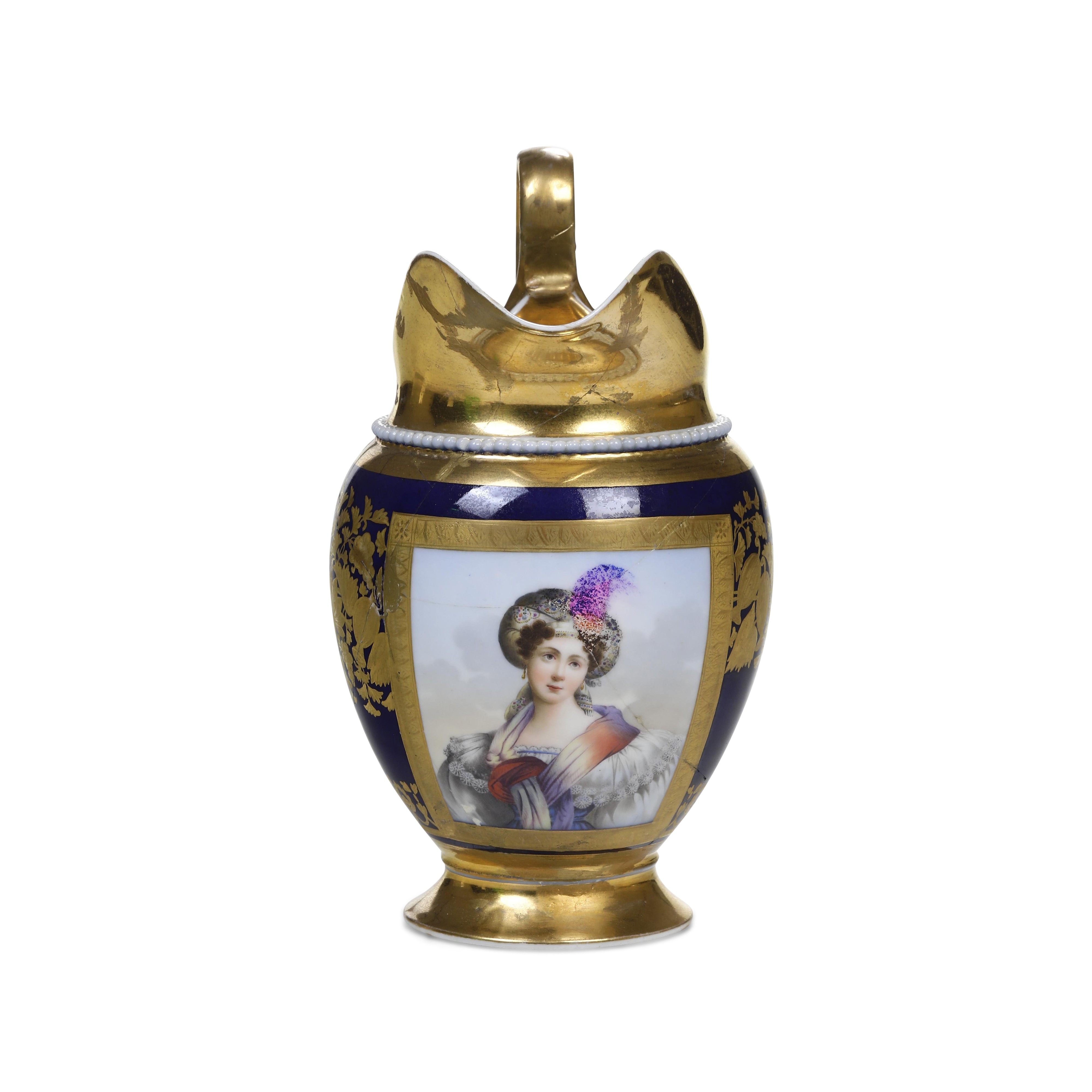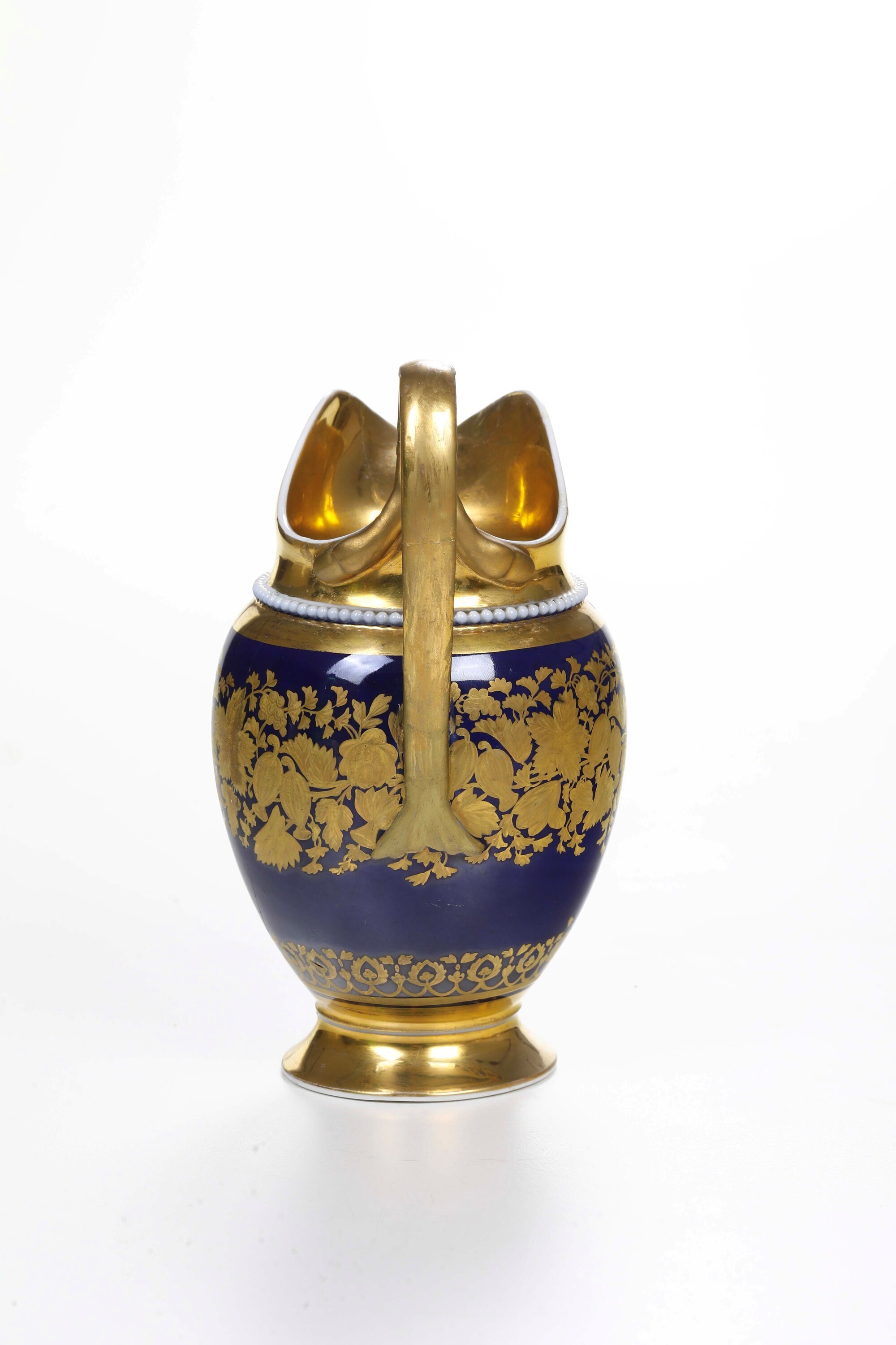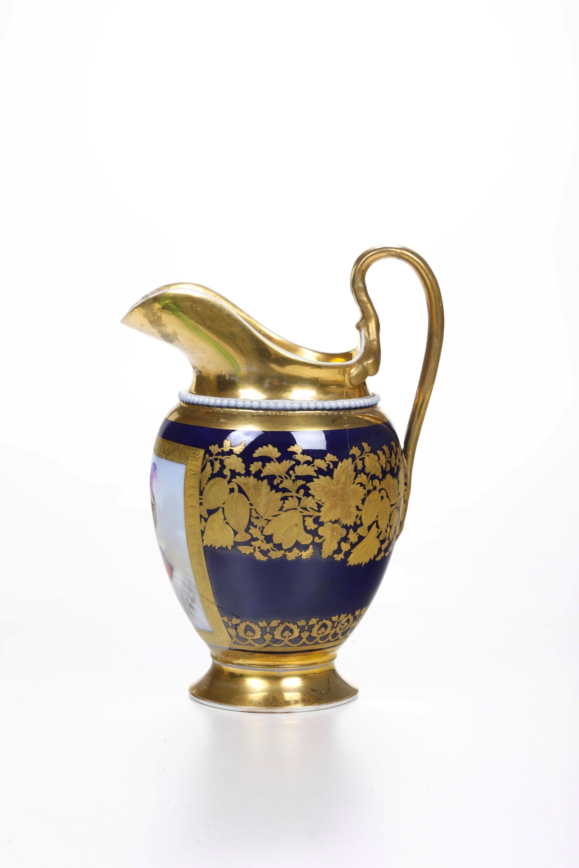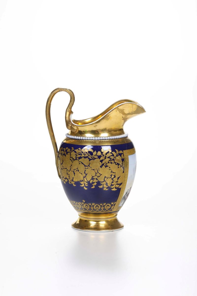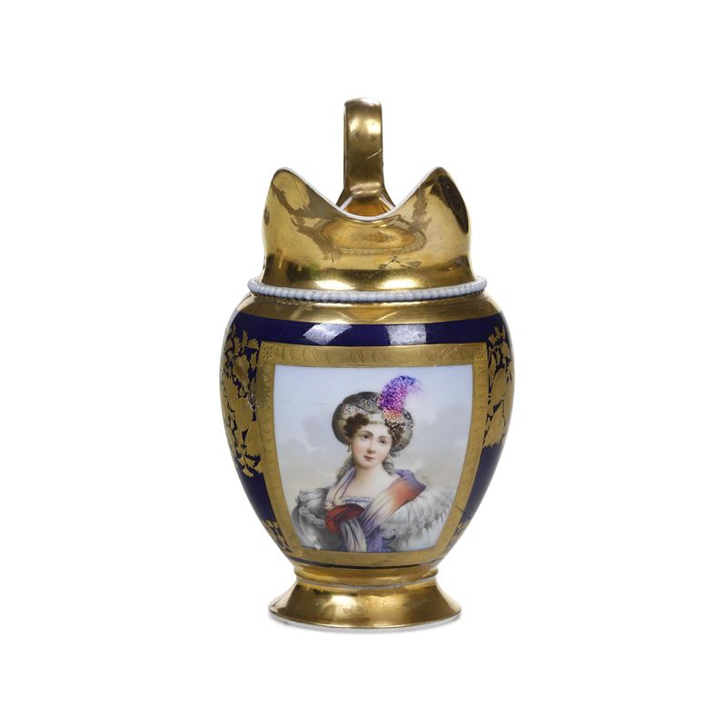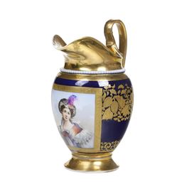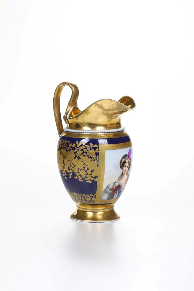 Questa lattiera è stupendamente dipinta in policromia con il ritratto di una giovane nobile posta in una riserva. Due fasce con motivi vegetali stilizzati in oro si stagliano sul fondo blu della superficie. Il piede, il beccuccio e la presa, che termina con due teste di cigno, sono dorati. Tra il corpo e il beccuccio si trova un’elegante corona di perline bianche