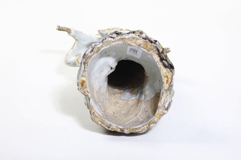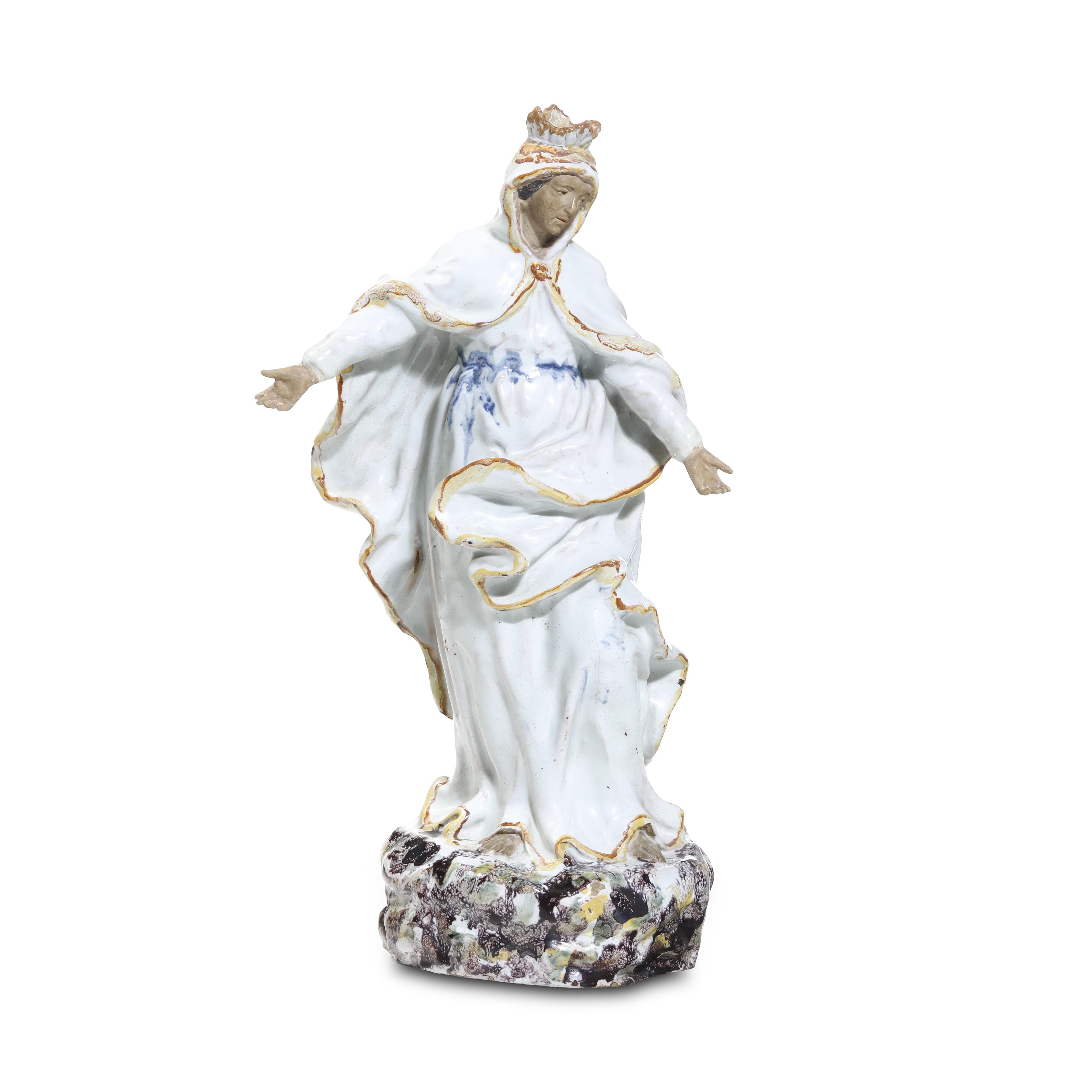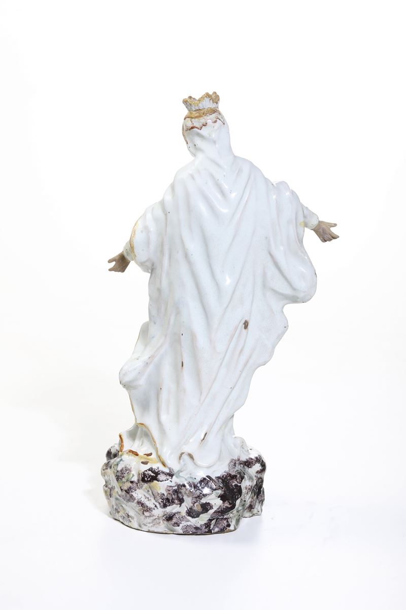 Questa figura di Madonna stante, è raffigurata su un alto piano roccioso con l’abito bianco animato dalla torsione con la gamba destra avanzata e le braccia aperte in gesto di benedizione. Appartiene al codice iconografico della Madonna della Misericordia di Savona (normalmente rivolta verso il beato Botta) prodotto dalle manifatture savonesi. In questo pezzo è particolarmente vivace ed elegante il movimento della figura e del suo abito profilato in giallo e il modellato del viso. (cfr. A.Cameirana, Ceramica in Banca, Albisola 1989, p.61