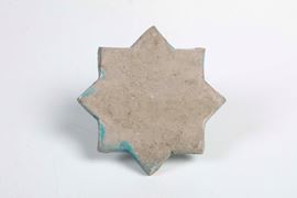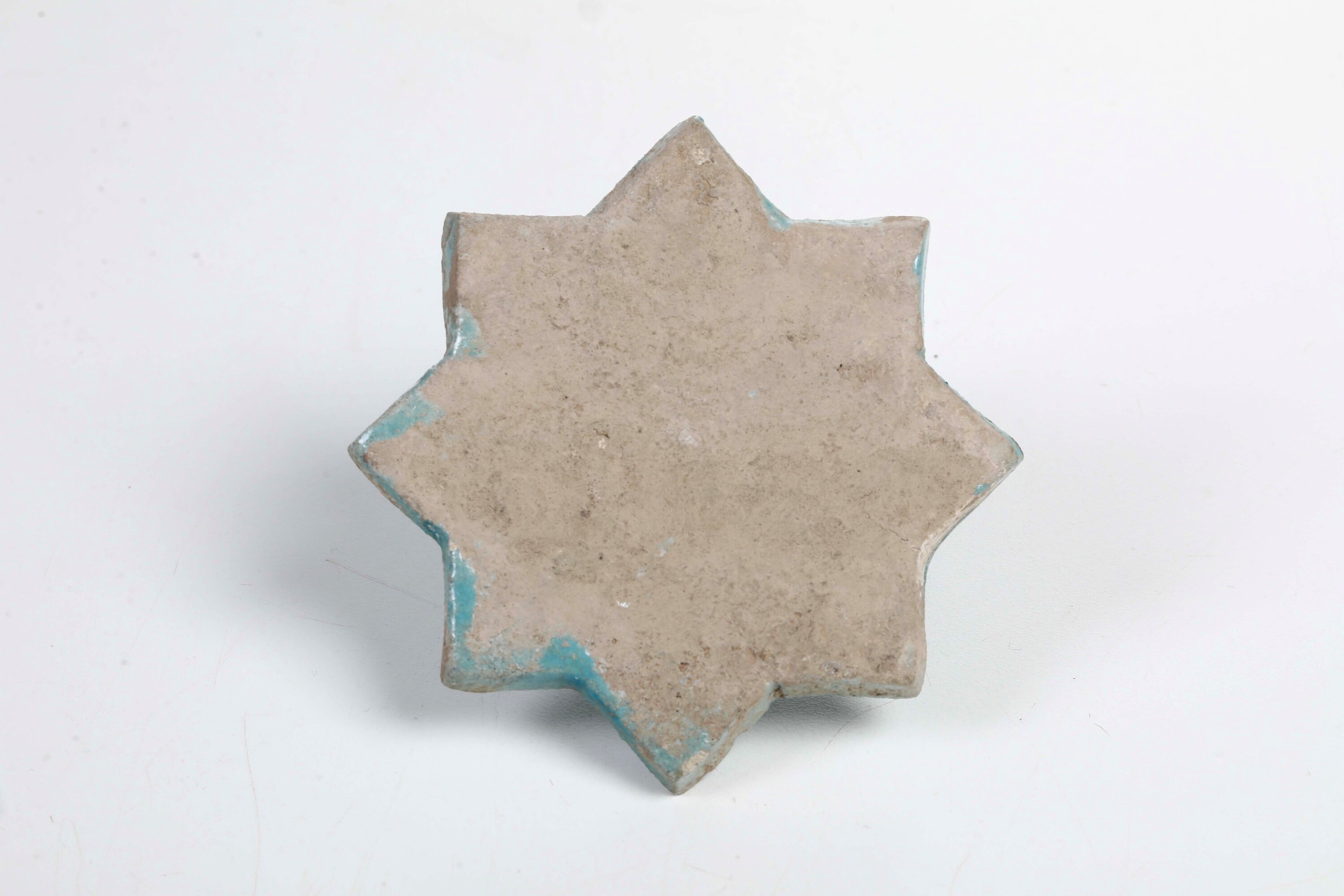 Rara mattonella architettonica dalla caratteristica forma a stella a otto punte, interamente rivestita da una vetrina monocroma di colore turchese. Al centro, è impreziosita da un cartiglio ovale a rilievo con un'iscrizione in caratteri cufici (probabilmente un'invocazione religiosa o un frammento poetico), che eleva l'oggetto da semplice elemento decorativo a manufatto di valore simbolico e spirituale