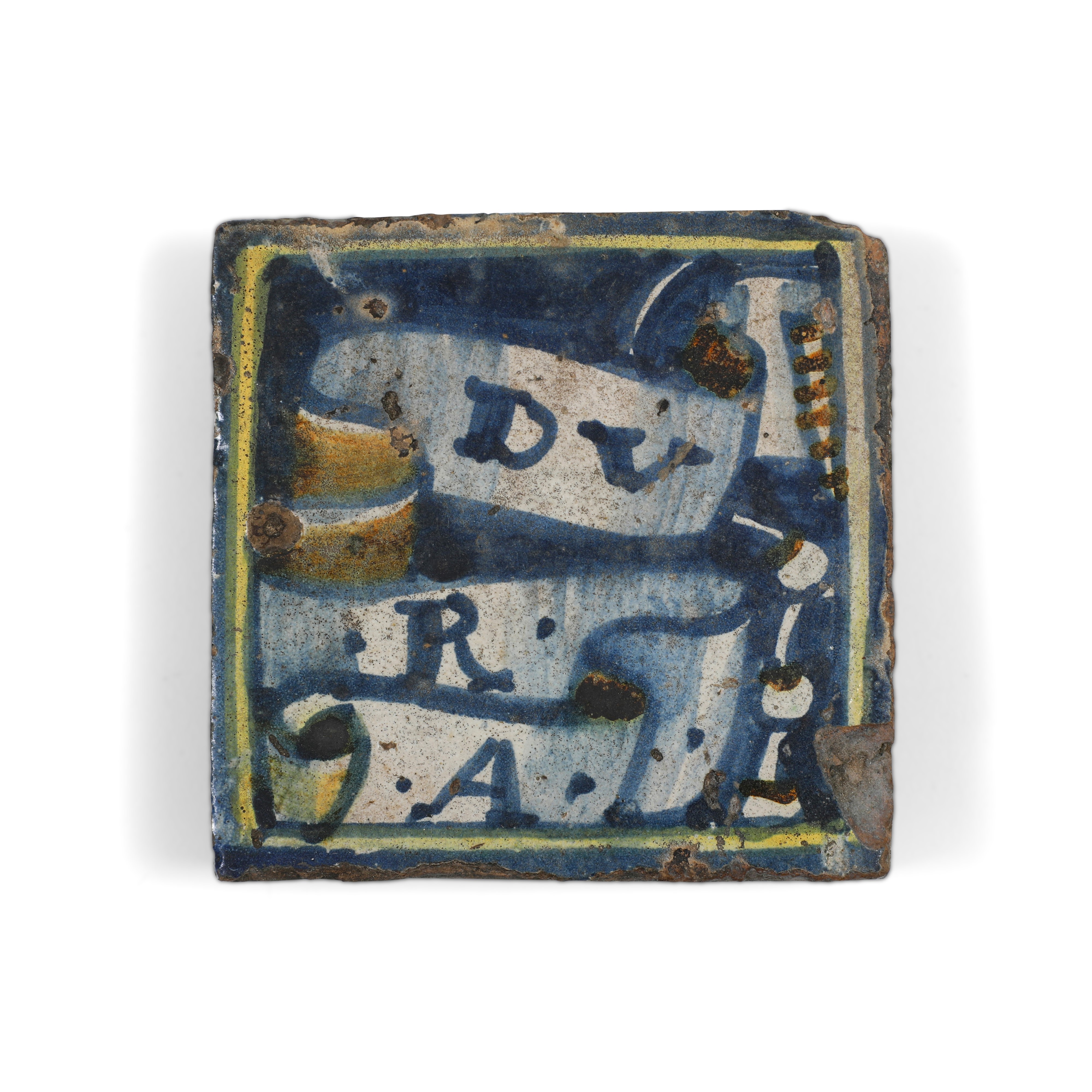 Mattonella decorata con un nastro ondulato che porta le lettere "DV R A”
