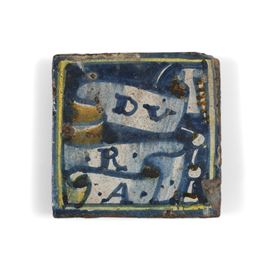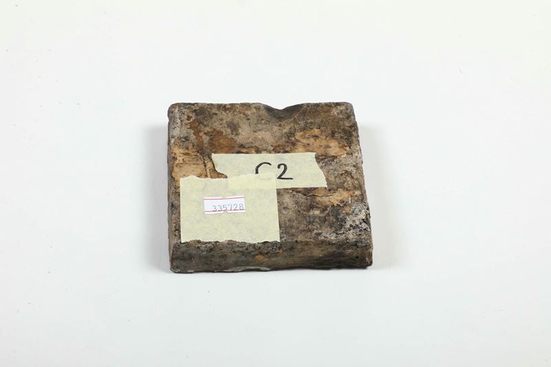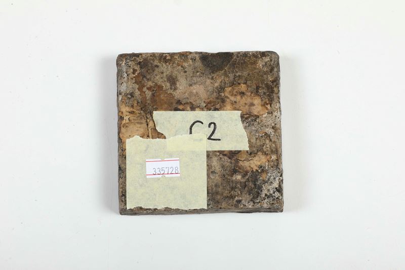 Terracotta smaltata. Dimensioni: spessore cm 2,2; cm 10,5x10,5. Conservazione: una sbeccatura al bordo e altre minori