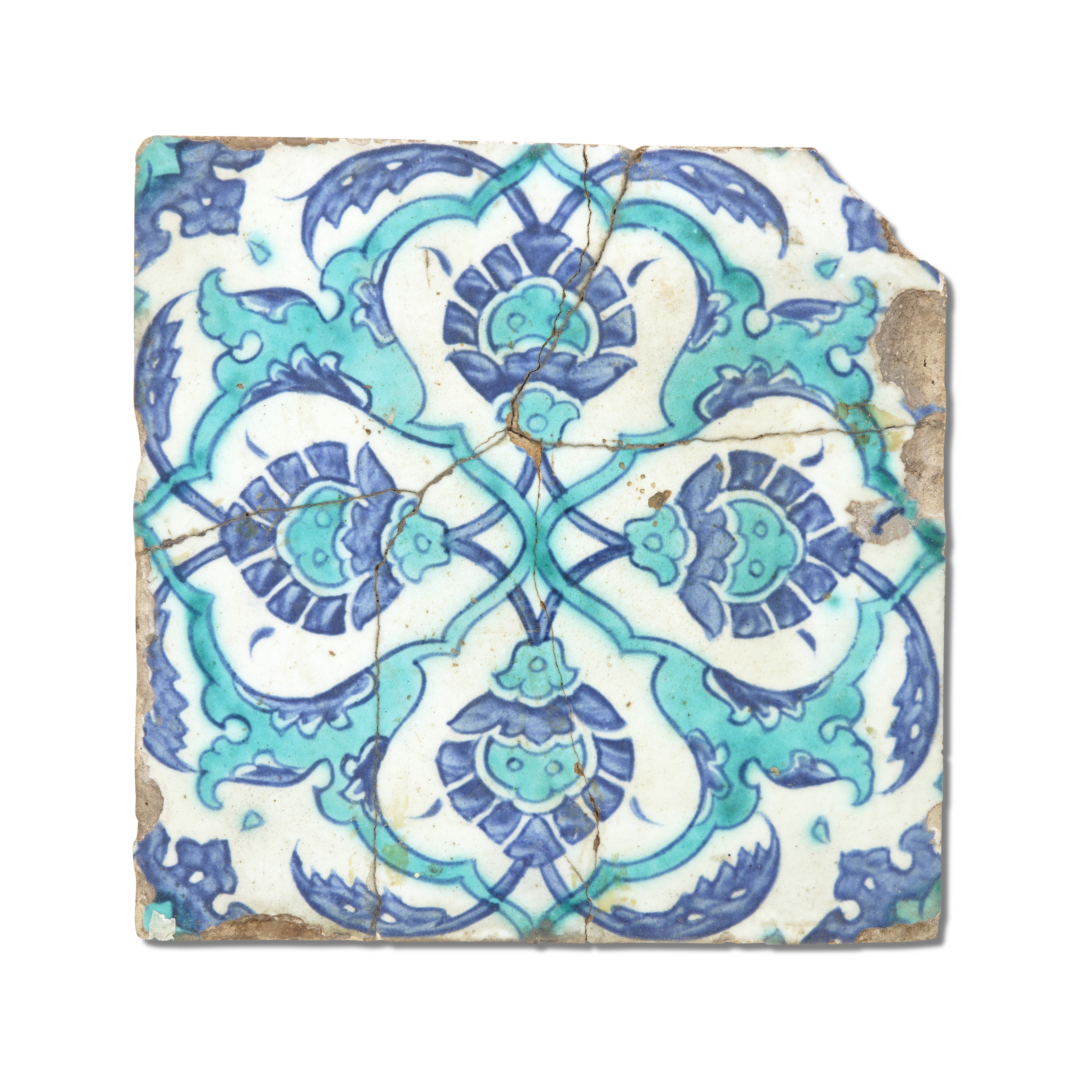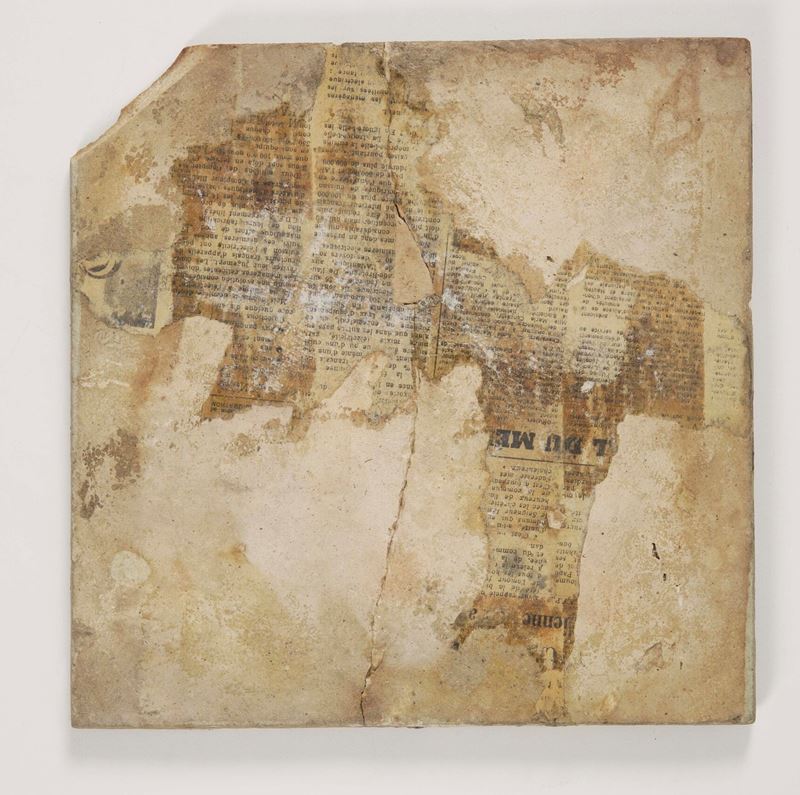 Ceramica silicea. Dimensioni: cm 25x25. Conservazione: rotta in cinque frammenti; mancanza a uno spigolo; sbeccature